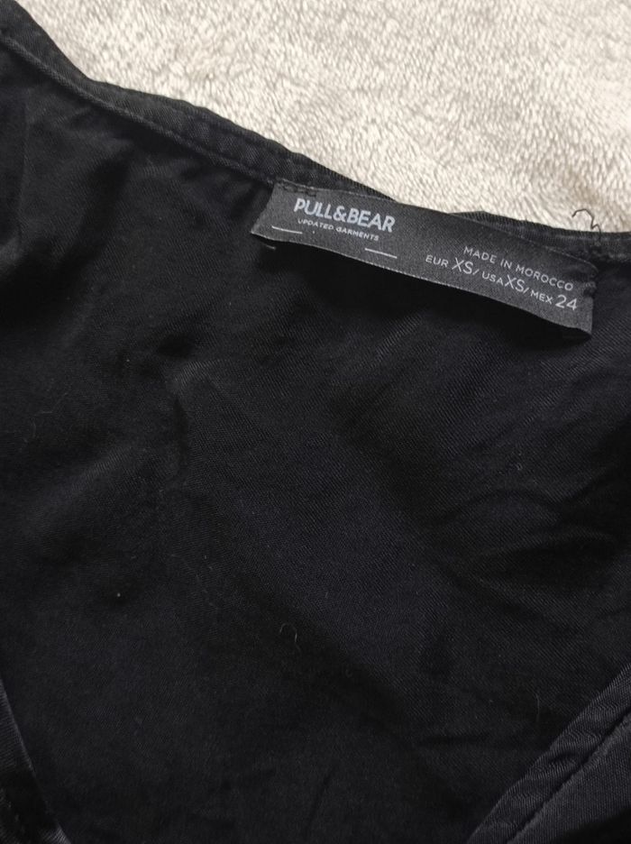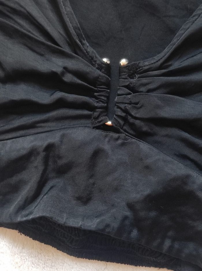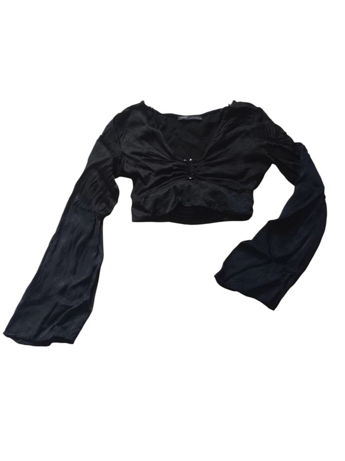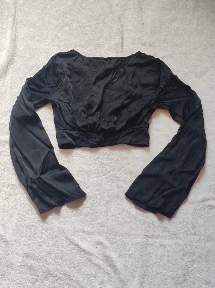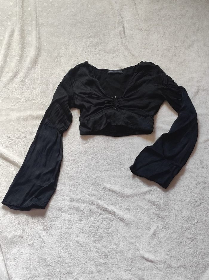 superbe haut court style croc top à manches longues. Petit anneaux en métal au milieu de la poitrine, élastique au dos. Manches longues et larges au bout. Décolleté en V, 100% viscose Marque pull and bear en taille XS. Ni trous tâches ou déchirures.