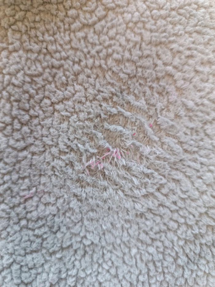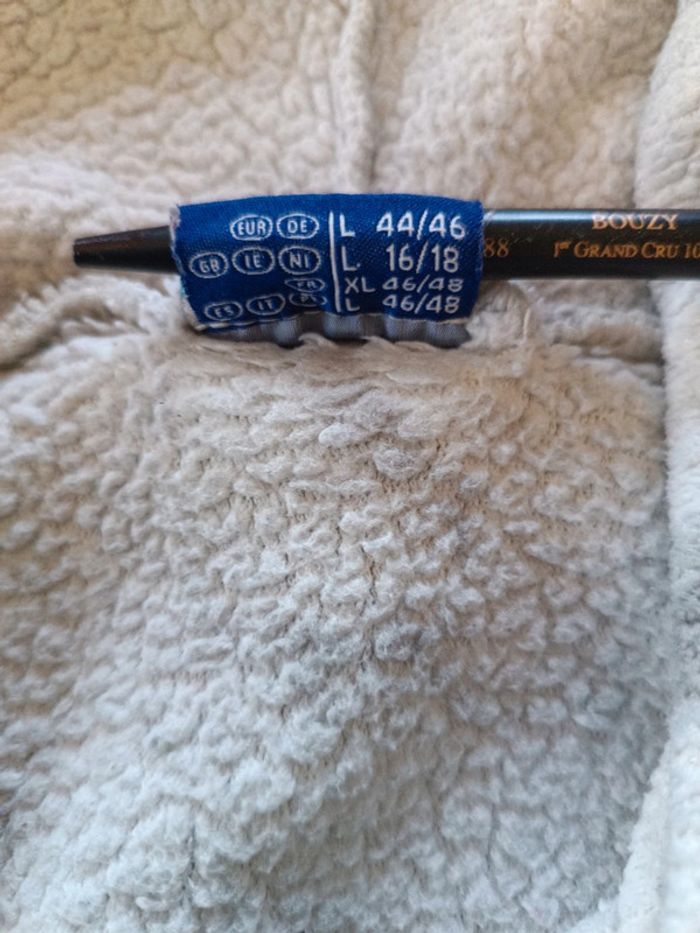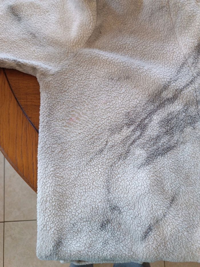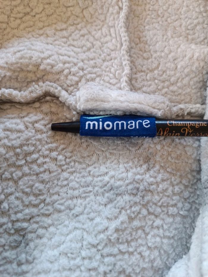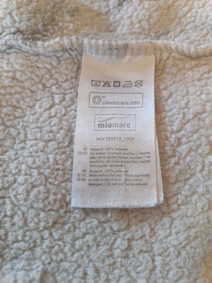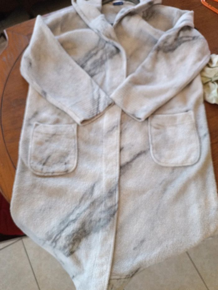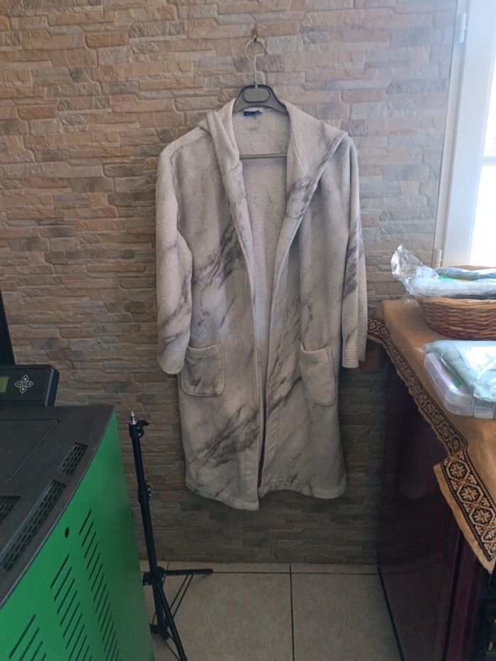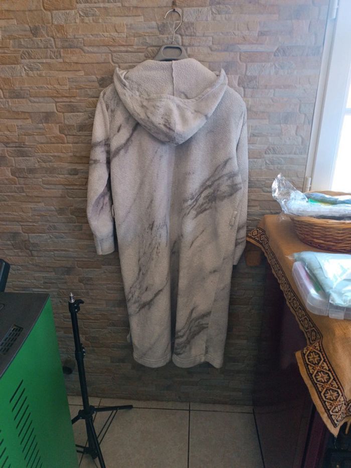 Peignoir polaire à capuche Miomare 46/48. Épaules 54 cm , aisselles 66 cm, longueur 106 cm. Avec ceinture retrouvée. Décor marbré. 100% polyester. TBE