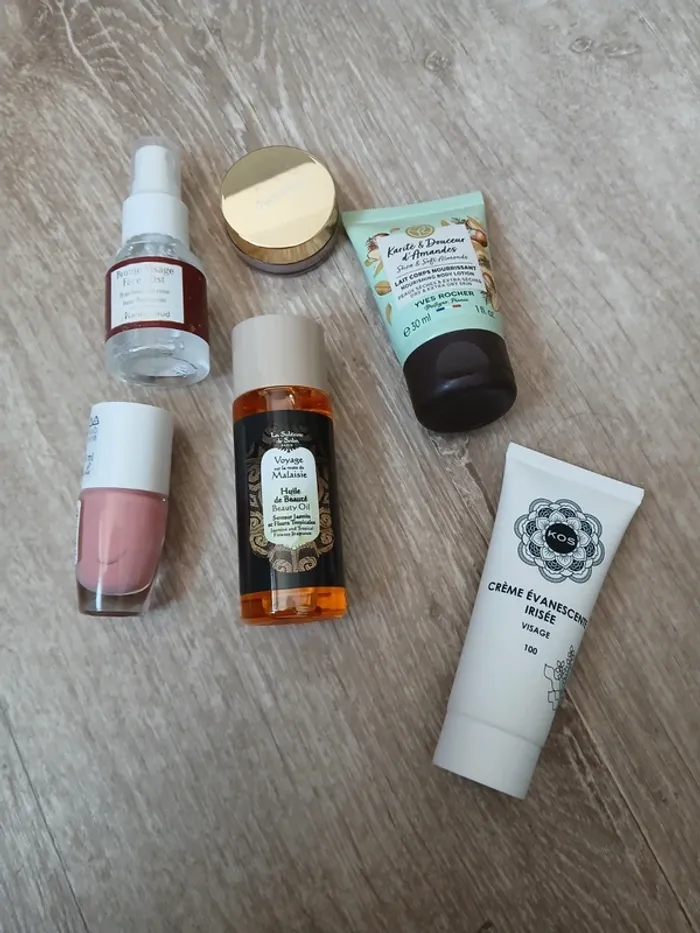 Lot de produits de beauté femme comprenant une brume visage marionnaud, un lait corps Yves rocher, un vernis, une créme visage, une huile de beauté, un gel enlumineur. Différentes marques sur ce lot. Je mets Yves rocher mais il y a Différentes marques #lotdeproduitsdebeauté #huile de beauté #cremevisage #gelenlumineur