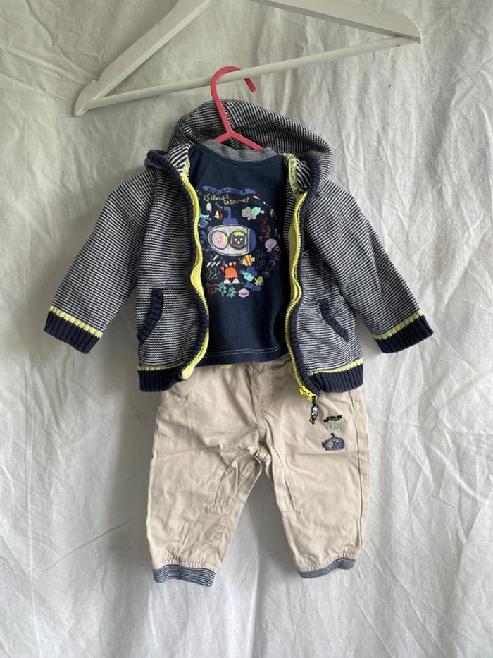 #6moisgarconkmcreation Pantalon + t-shirt et gilet assorti