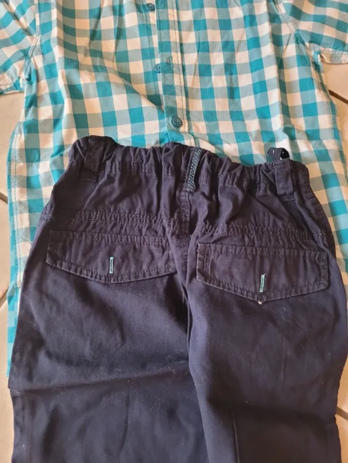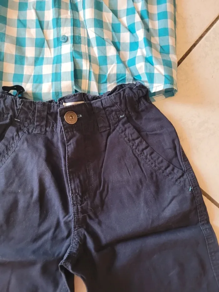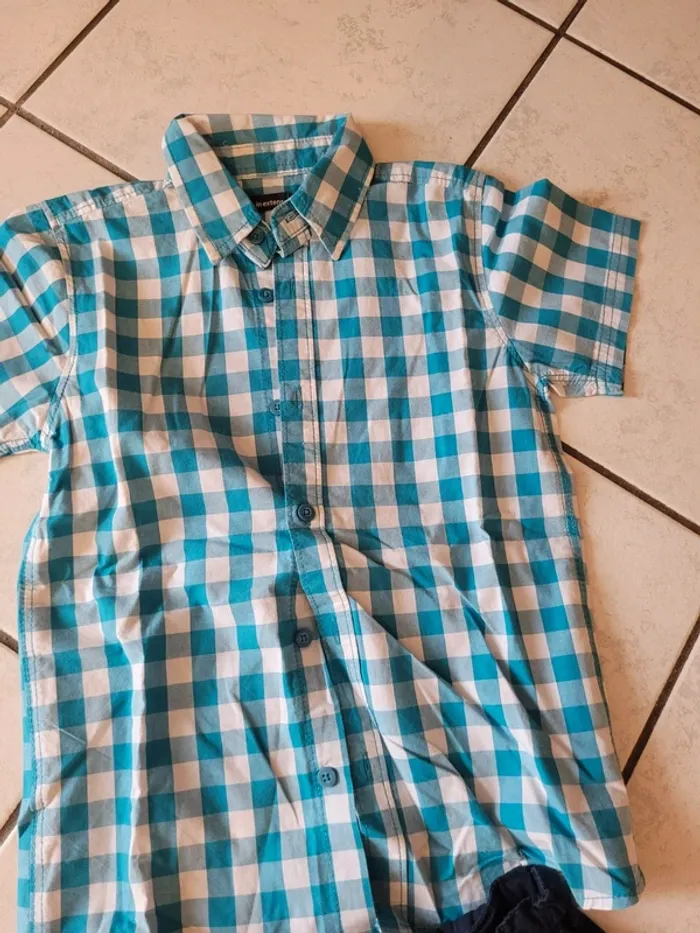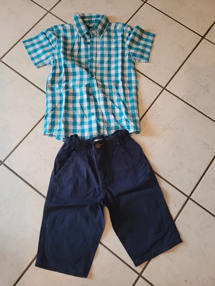 Taille 8 ans - 1 bermuda marron In Extenso Taille ajustable 100% coton Très bon état - 1 regular fit gris Kiabi Taille ajustable 100% coton Très bon état - 1 ensemble chemise short I´ Extenso Chemise à carreaux turquoise et blanche Fermeture par boutons 100% coton 1 short bleu marine Taille ajustable 100% coton État proche du neuf