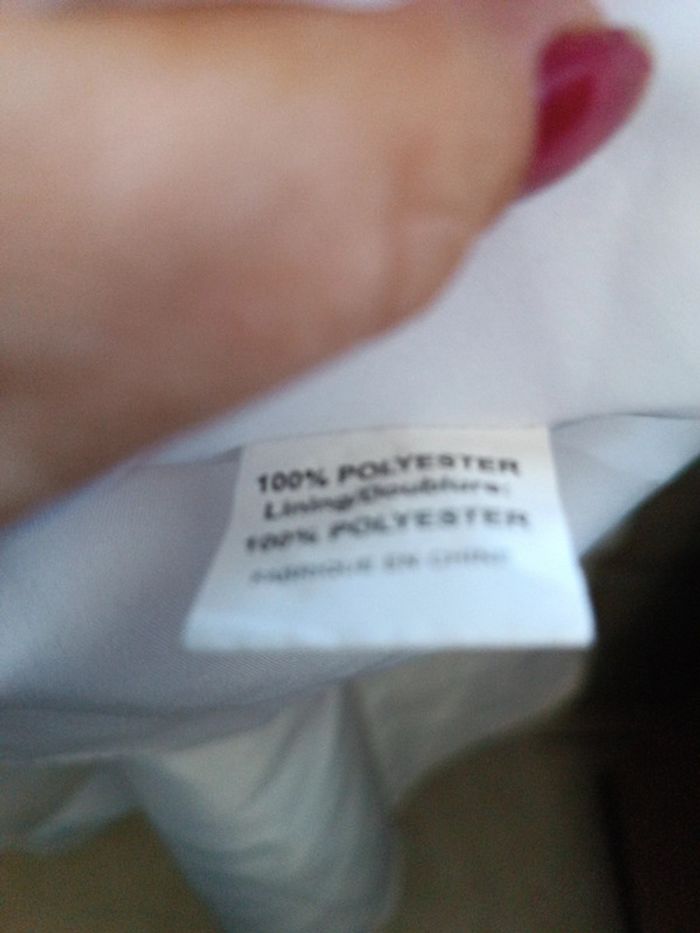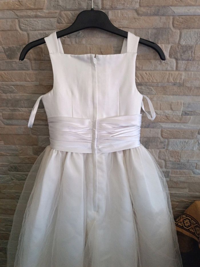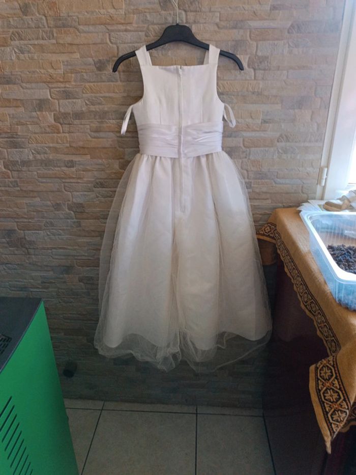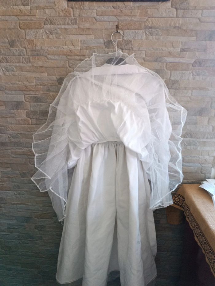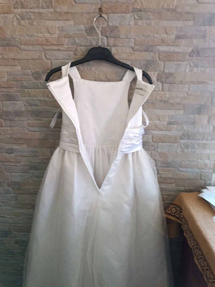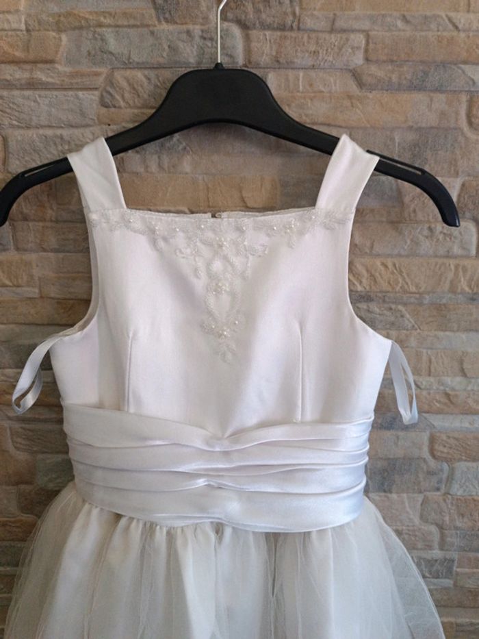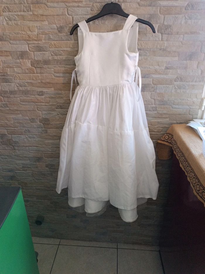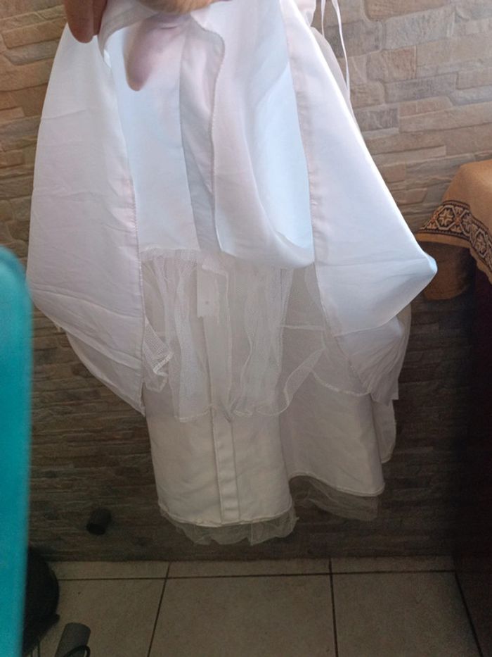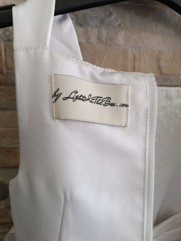 Robe blanche Light in the Box 4A. Aisselles 30 cm, longueur 92 cm. Broderies perles. Plusieurs jupons tulle. ceinture satin. 100% polyester. TBE
