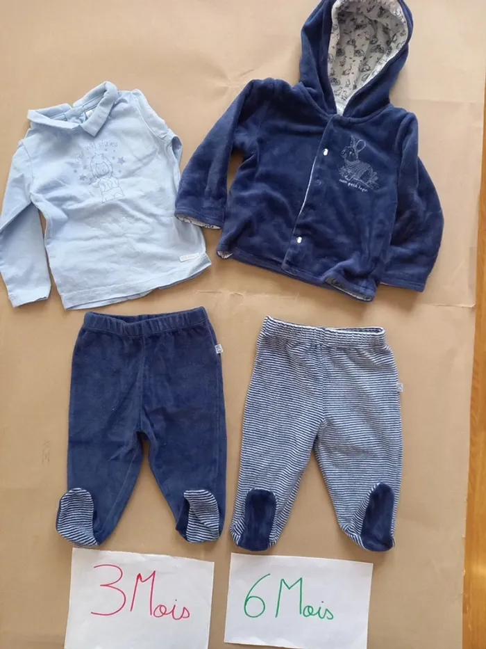 Ensemble velours 3-6 Mois TEX -Gilet à capuche -2 pantalons avec pieds ⚠️-T-shirt offert (voir col)⚠️ Très bon état #clairefvetementsgarçon3mois #clairefvetementsgarçon6mois