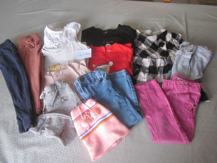 24m, robe + collants + 2 jeans + 4 hauts ml + chemisier + 3 pantalons + bonnet offert, zara, gemo, tao, tex, vert baudet