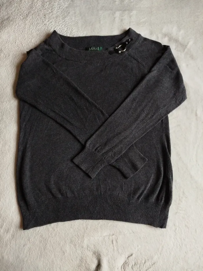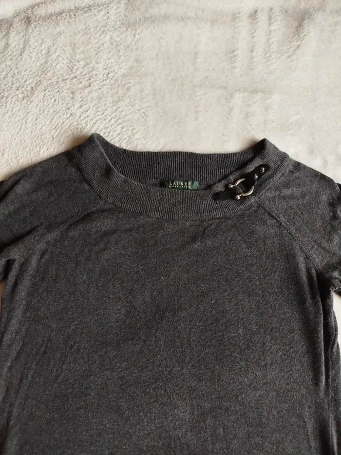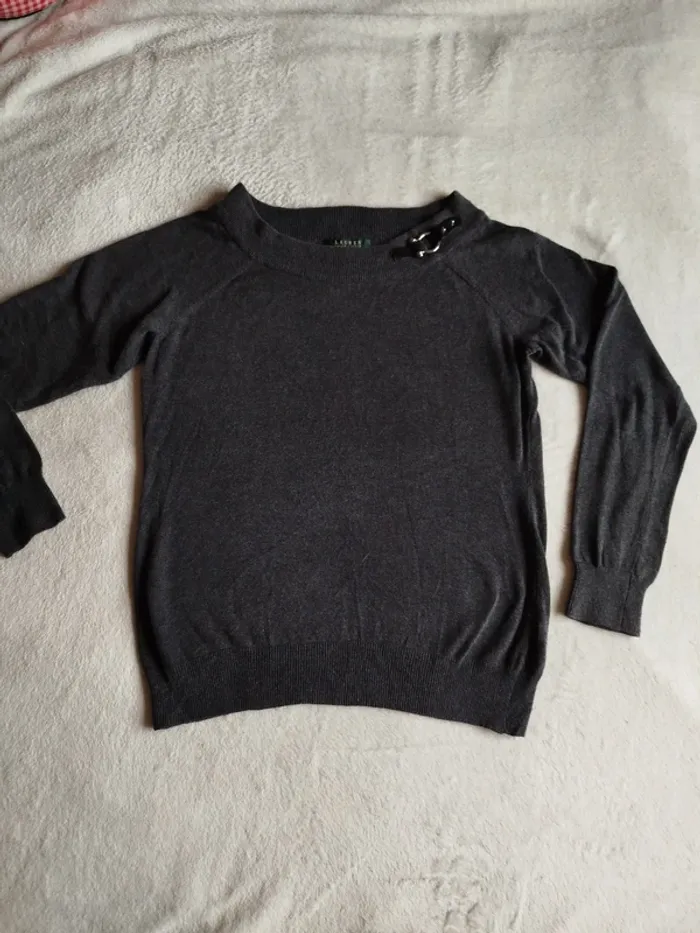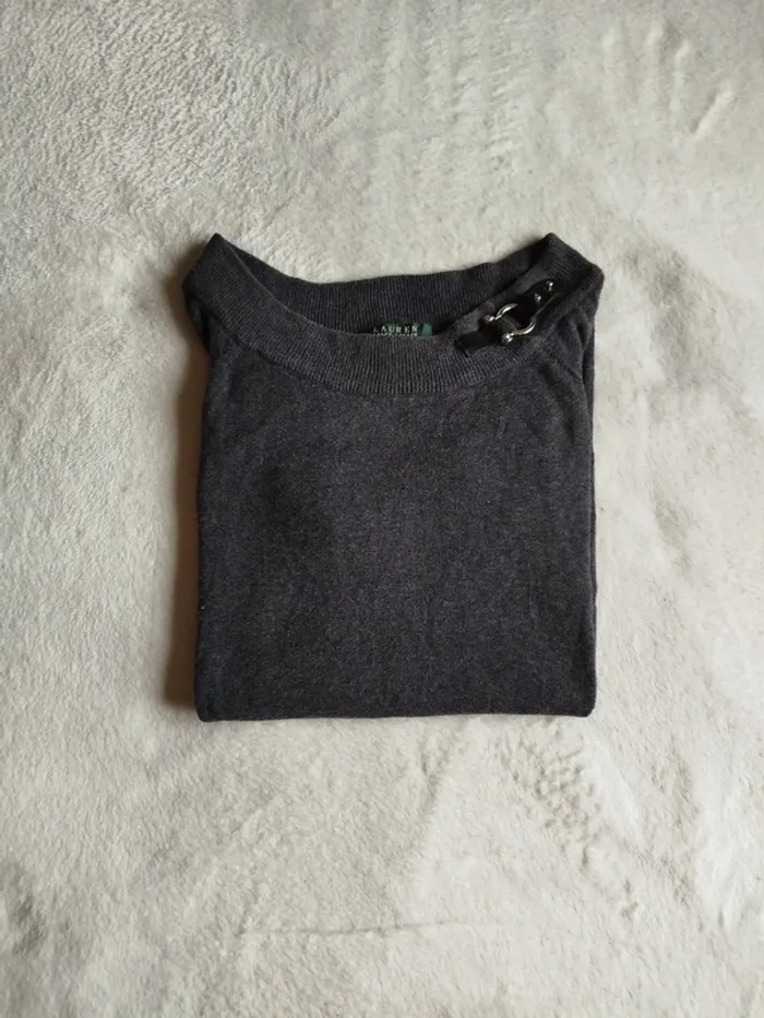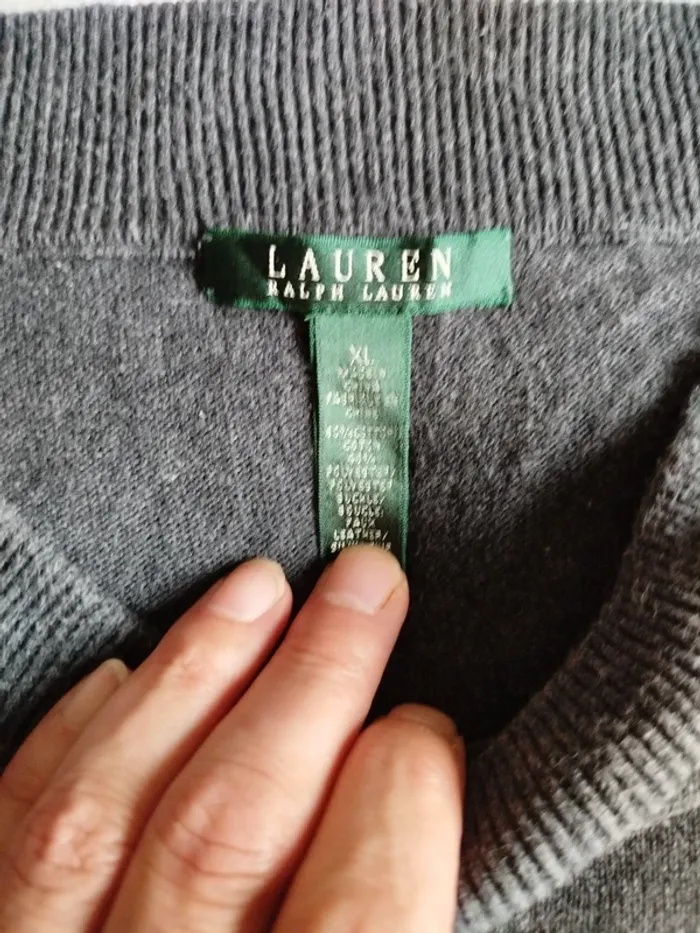 👕 Pull vintage femme Lauren Ralph Lauren 📏 Taille XL 🎨 Gris 👍 Pull vintage en bon état avec quelques bouloches Avec simili cuir noir
