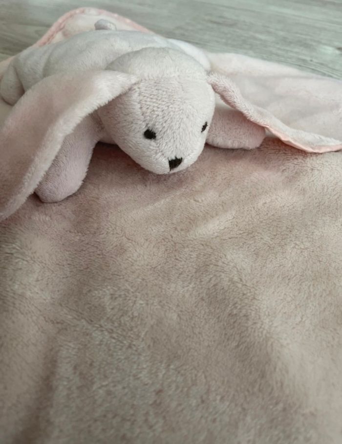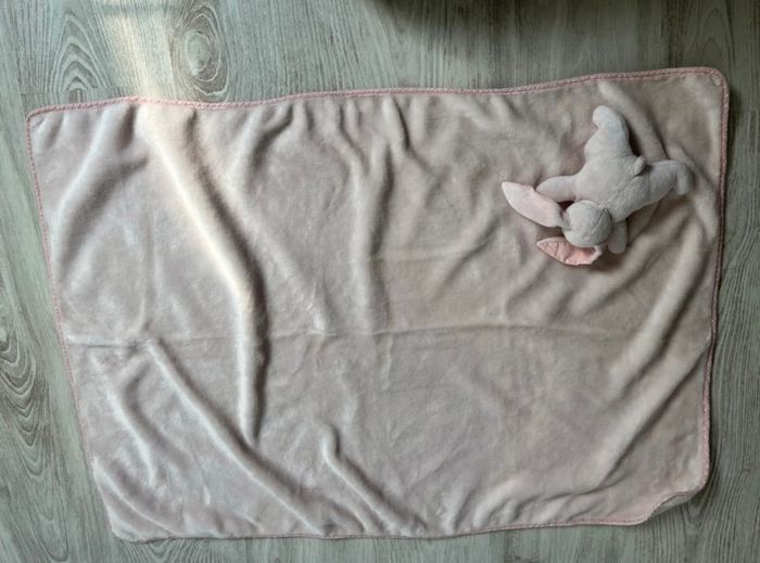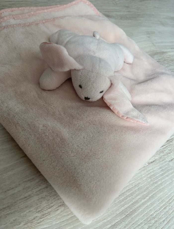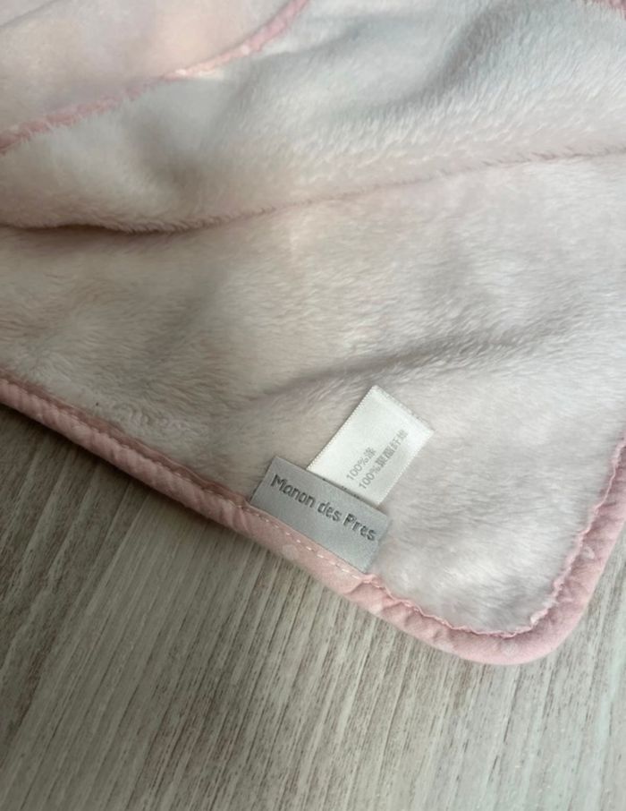 Couverture rose molletonnée avec un doudou inclus de marque Manon des pres neuf jamais servis. Juste était lavé