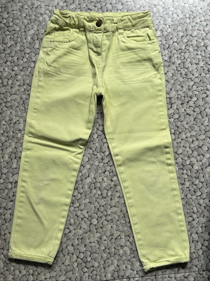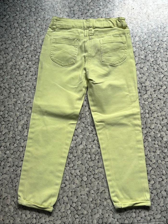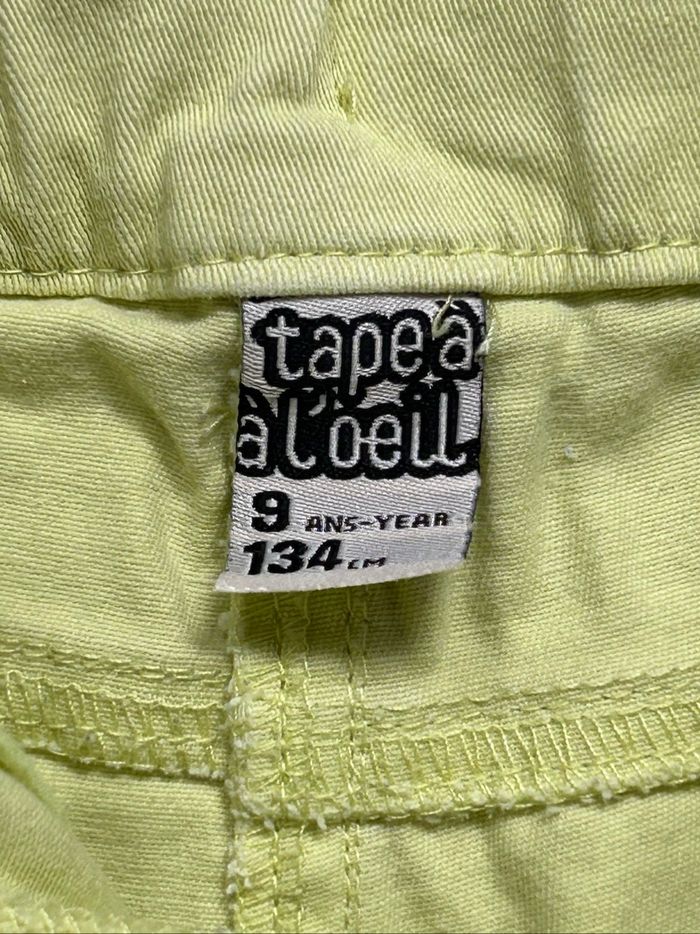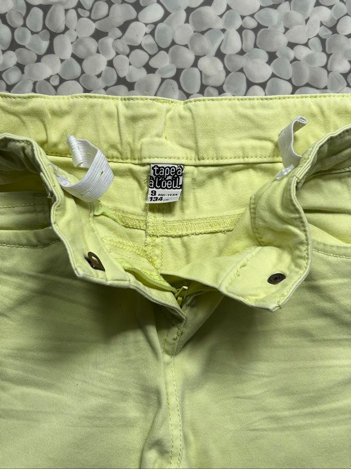 pantalon mi-saison pour fille de la marque Tape à l'œil, de couleur jaune clair. Taille 9 ans. Longueur de jambes 50 cm, avec petit revers en bas. Élastique à la taille pour ajuster. Une toute petite tache en bas à gauche. (Voir photo). En très bon état.