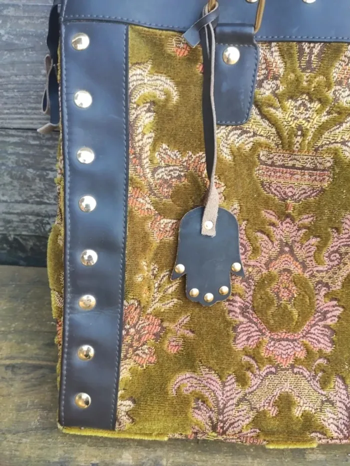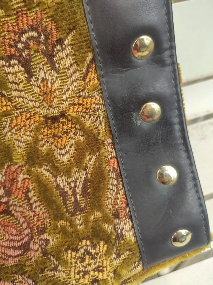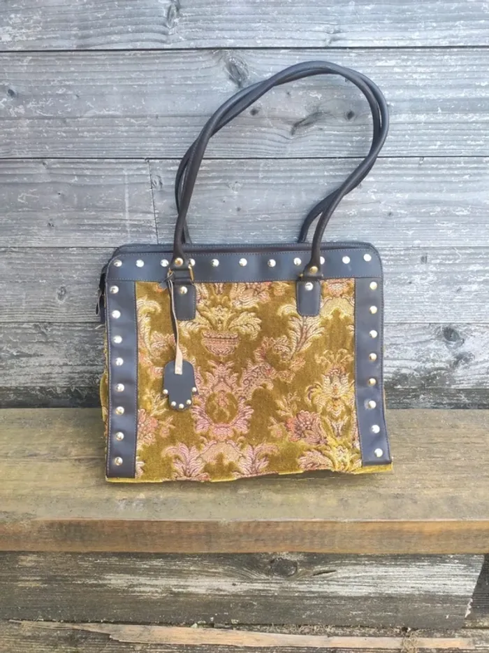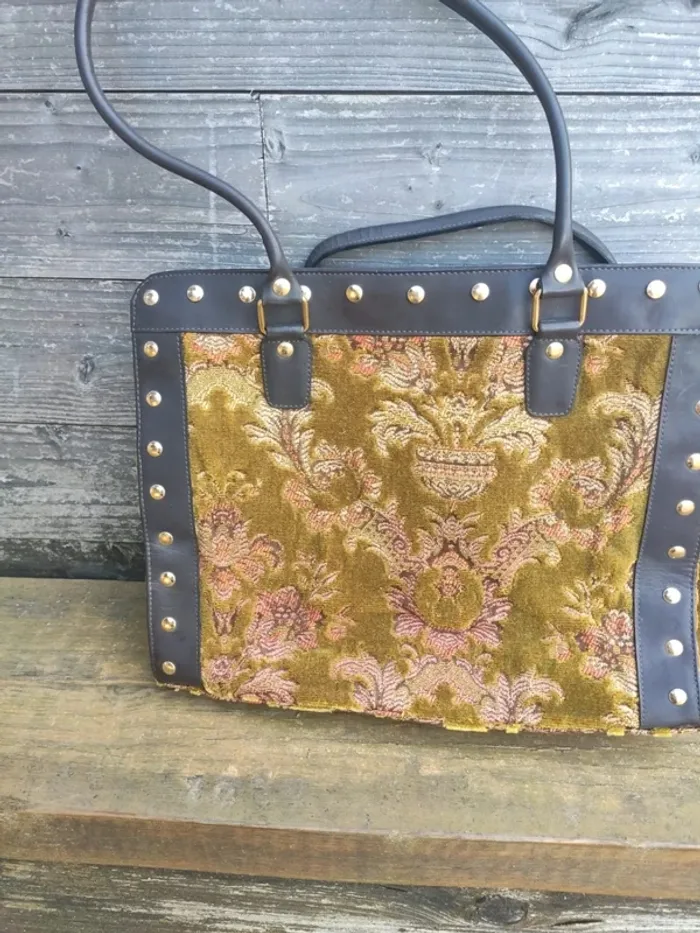 Grand sac tapisserie et cuir clouté. Dimensions 39 cm x 31 cm x 12 cm. Entièrement doublé, petite poche à l'intérieur et fermeture du sac par fermeture éclair. Bon état, abimé a un seul endroit, voir photo. Marque Bohème urbaine. #vulariFemmesVintage #vulariSacs