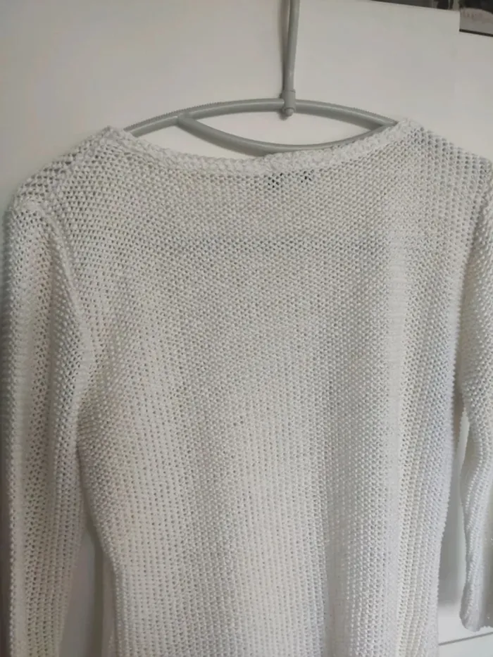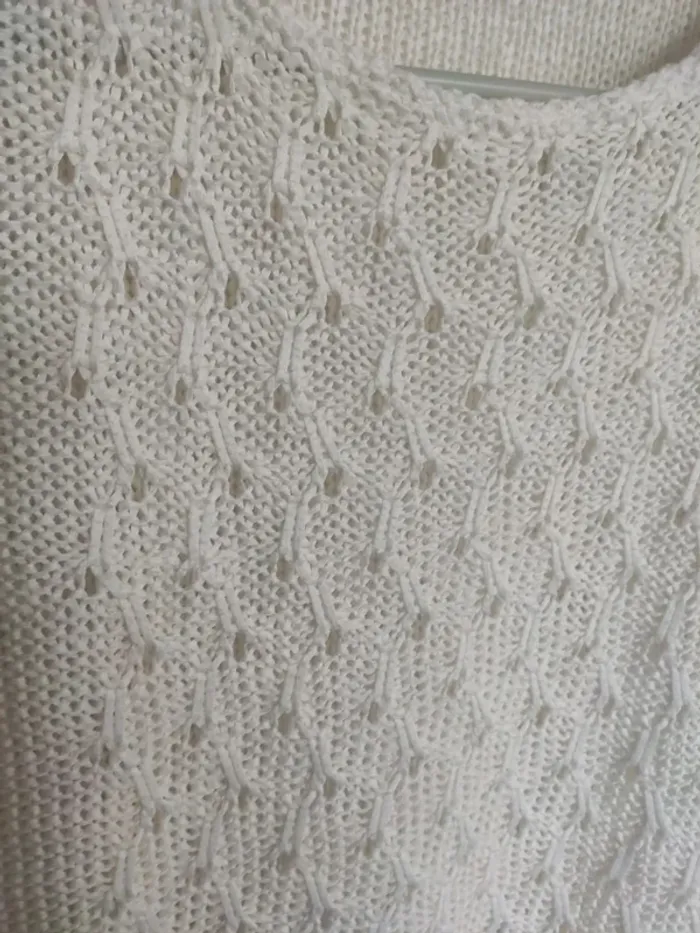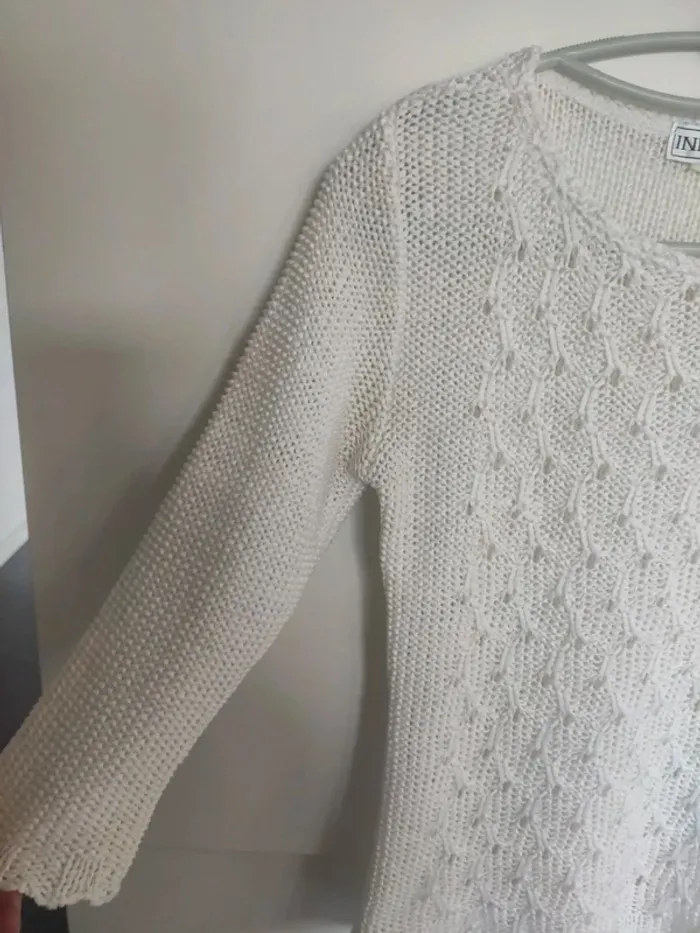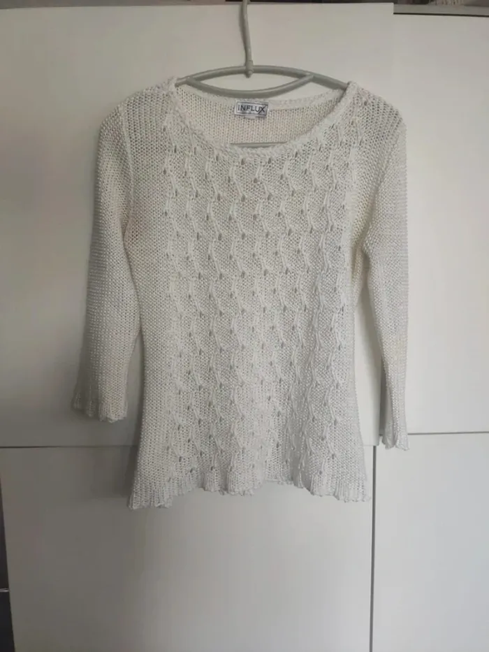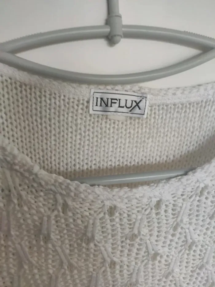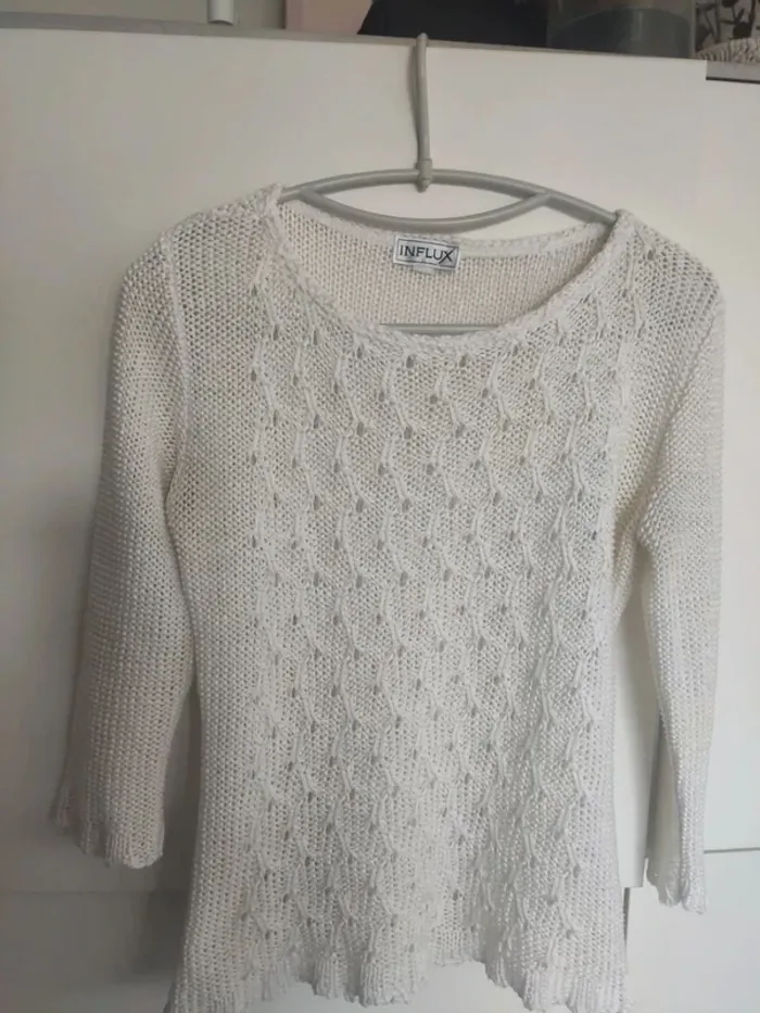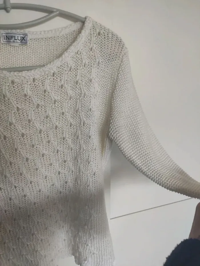 Maille un peu torsadée devant, maille ajourée partout, on voit à travers donc. Manches 3/4. Attention ! Traces jaunes sous les aisselles, à passer à la javel peut être. Marque Influx. Il est écrit 42 / 44 sur l'étiquette mais je dirais plutôt 38 / 40. #vulariFemmesM38 #vulariFemmesL40 #vulariFemmesXL42