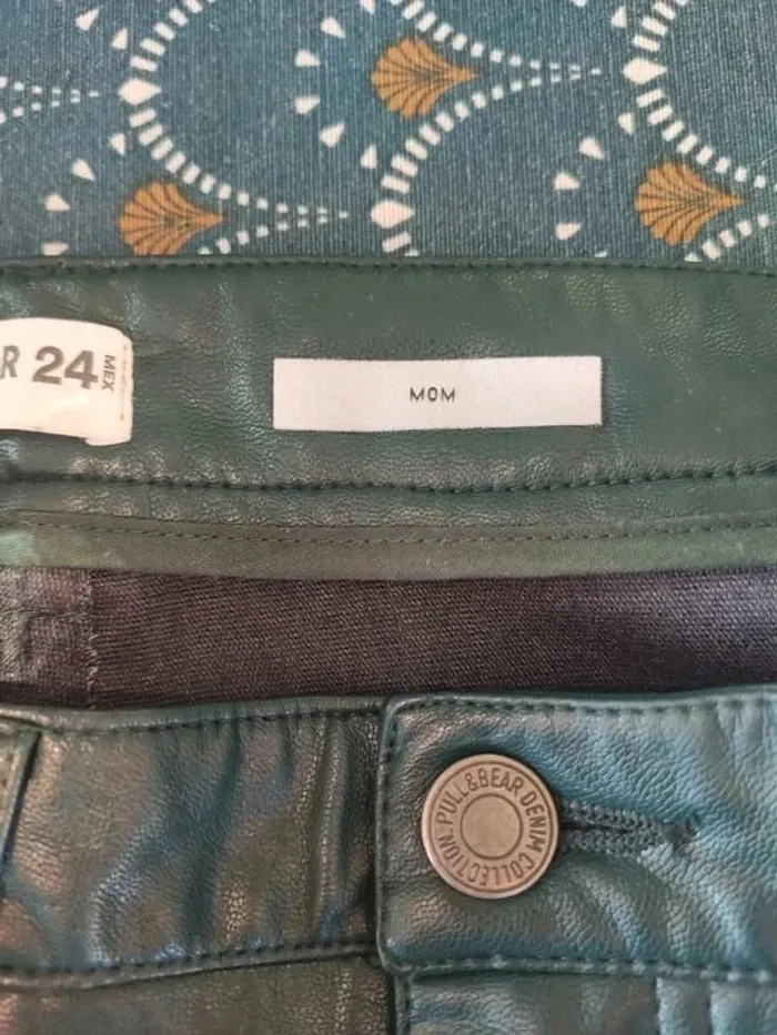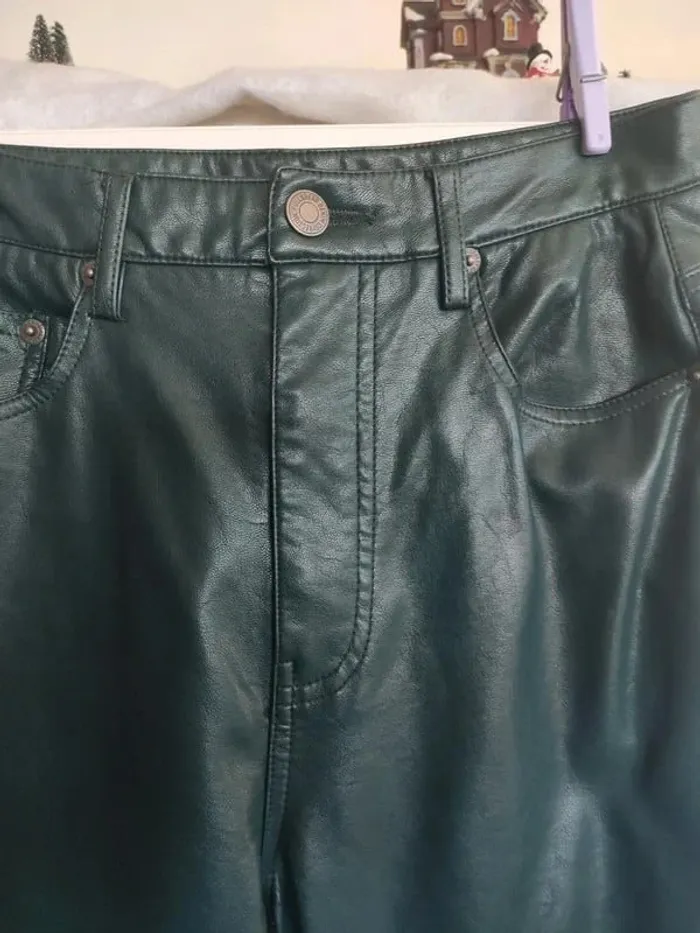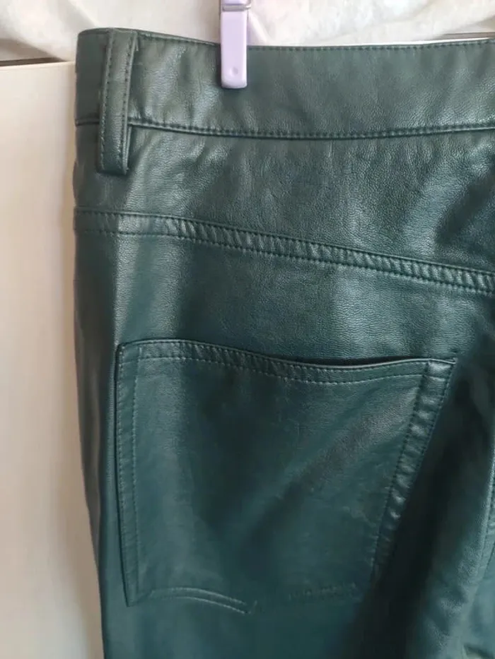 Pantalon coupe Mom aspect cuir brillant vert sapin. Mais ce n'est pas du cuir bien sûr. Peu mis, en très bon état ! Longueur totale 96 cm. Inutile de me demander une photo porté je ne rentre plus dedans 😂 acheté à pull & bear, taille 34 #vulariFemmesXS34 #vulariPullBear