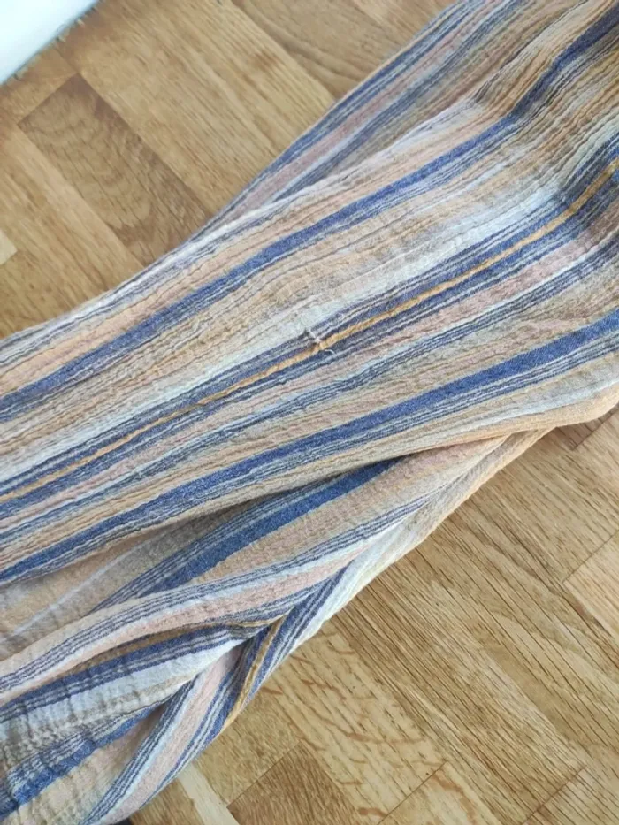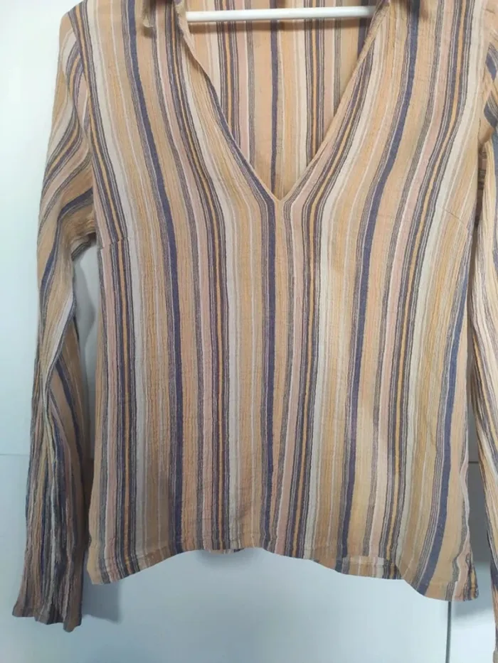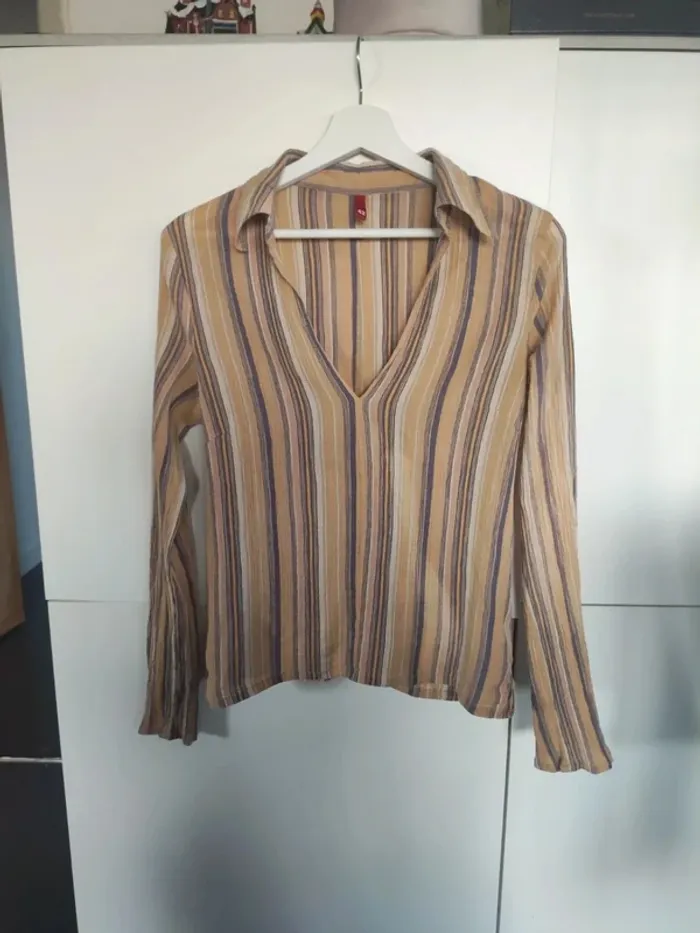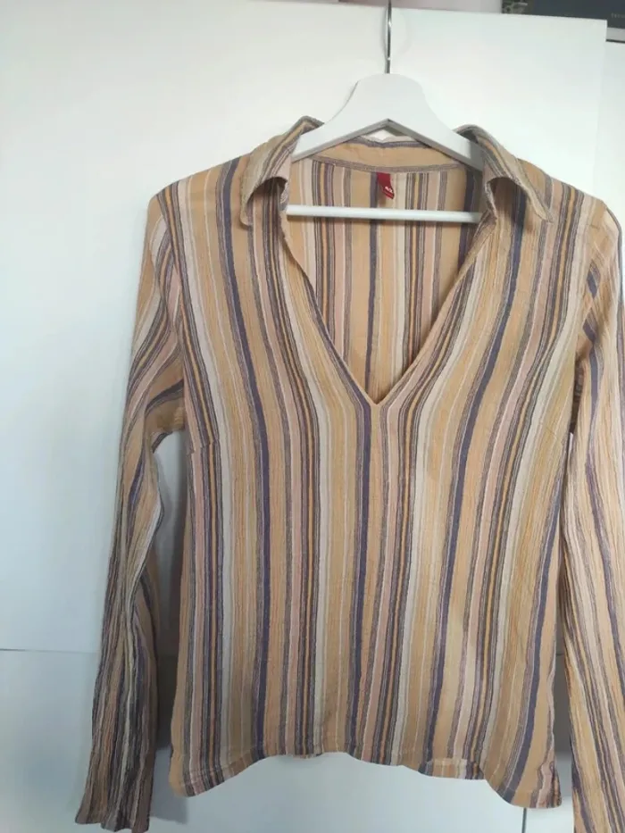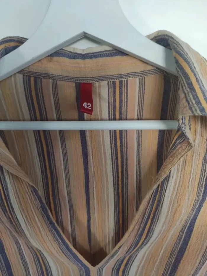 Tissu style crêpe, rayé en dégradé de jaune et bleu. Grand col V, pinces sous la poitrine. Taille 42 mais taille clairement petit, correspond plutôt à du 40. Manches longues. Arrention un défaut sur une manche, voir photo. Sinon très bon état #vulariFemmesL40 #vulariHetM