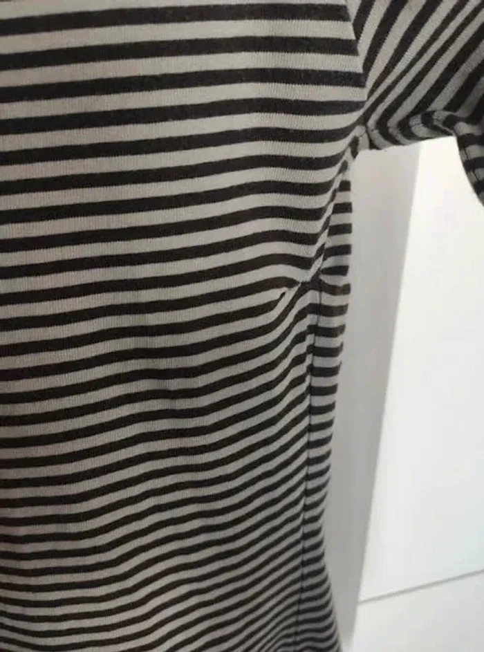 Tee shirt rayé gris et noir hyper doux avec de l'élasthanne. Mais il y a 2 soucis. L'étiquette de la taille a été coupée mais à vue de nez c'est du 12 ans et un côté a été recousu voir photo, d'où le prix. Sinon comme neuf #vulariFilles12ans #vulariOkaidi