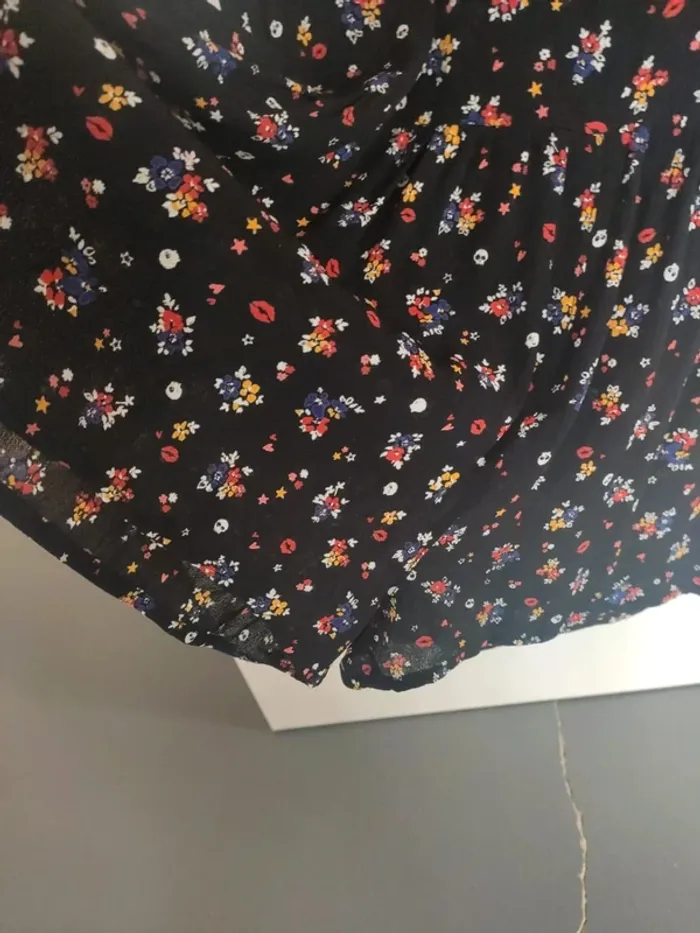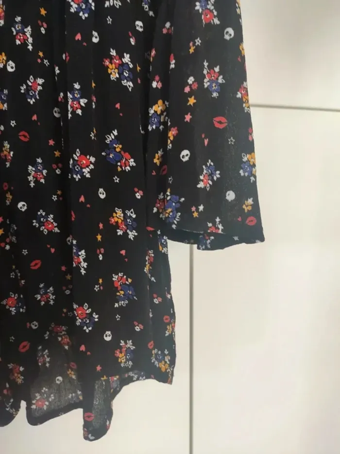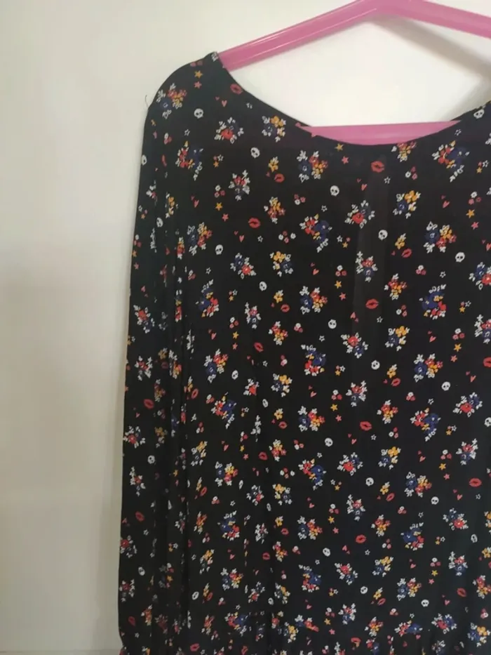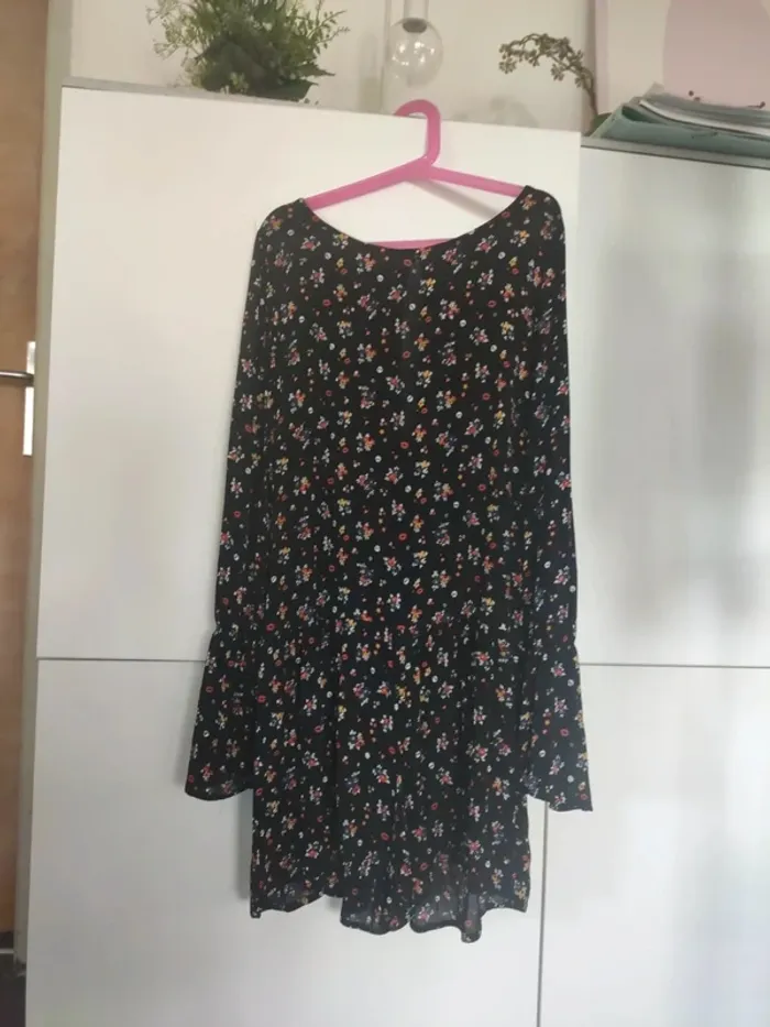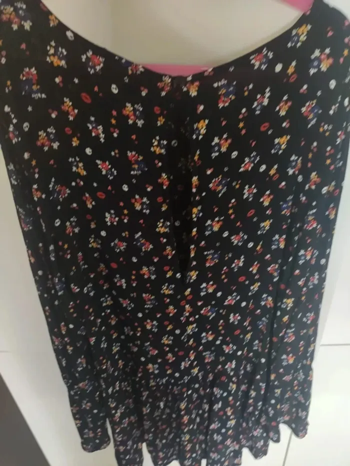 Robe short à manches longues. Petite ouverture sur le dos, fermée par bouton. Manches resserrées avant les poignets. Légère mais pas transparente. Noire à petites fleurs multicolores Très bon état, peu portée. Taille XS. Jennyfer #vulariFemmesXS34 #vulariJennyfer
