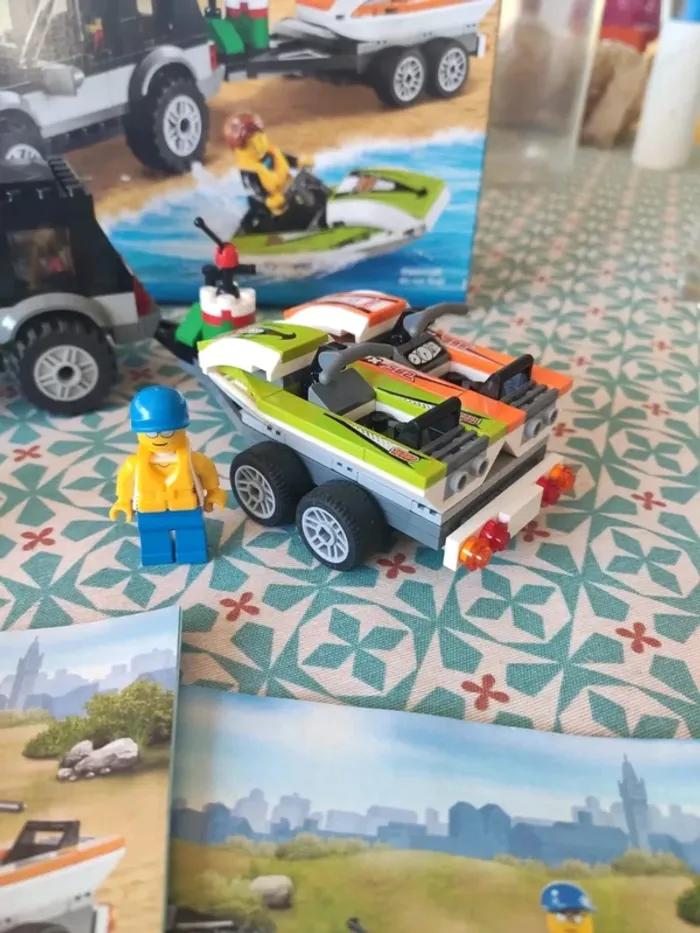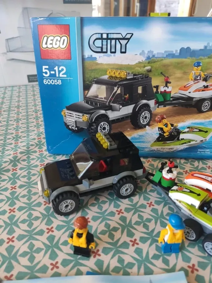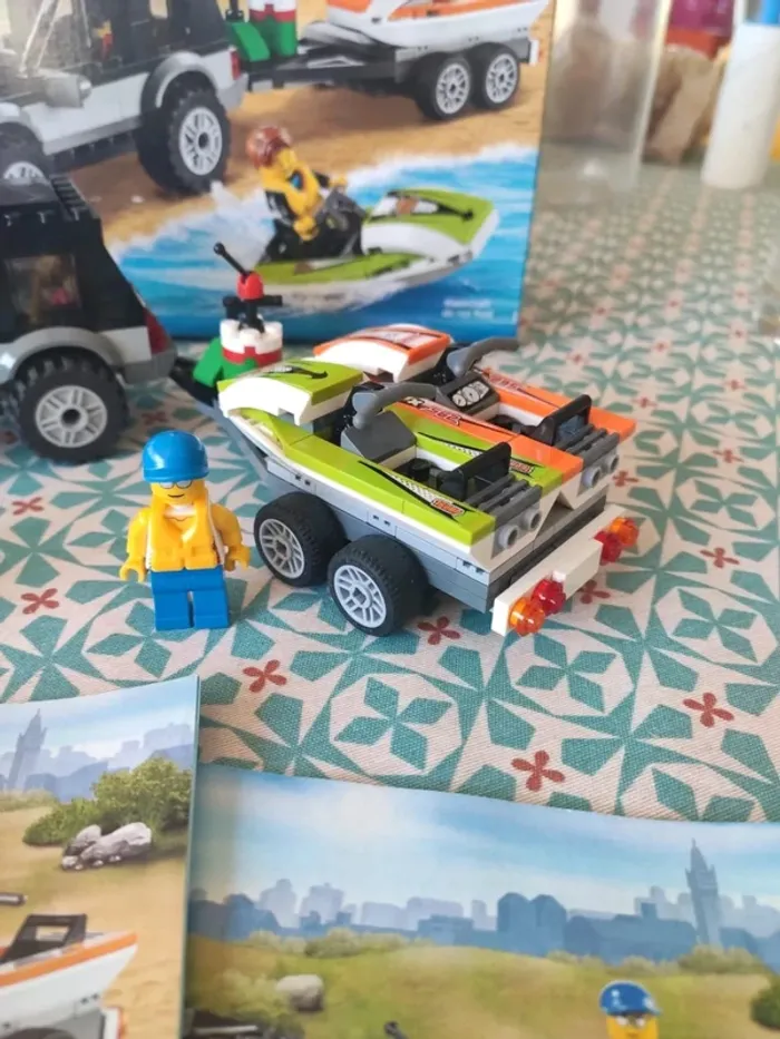 Le 4x4 de transport des scooters des mers Très bon état, complet, tous les éléments y sont. Manque juste un autocollant sur un des personnages et deux sur les jet ski mais ne gêne en rien le jeu. Vendu avec les notices et la boîte en bon état. Marque Lego. De 5 à 12 ans #vulariLego #vulariJeux