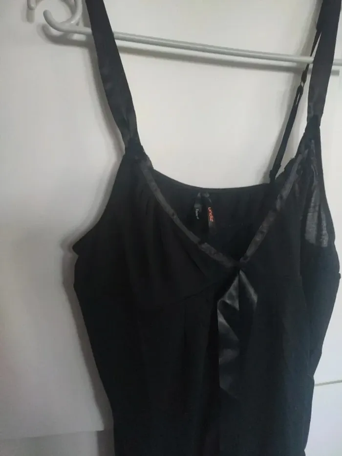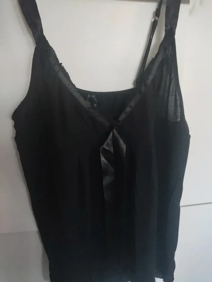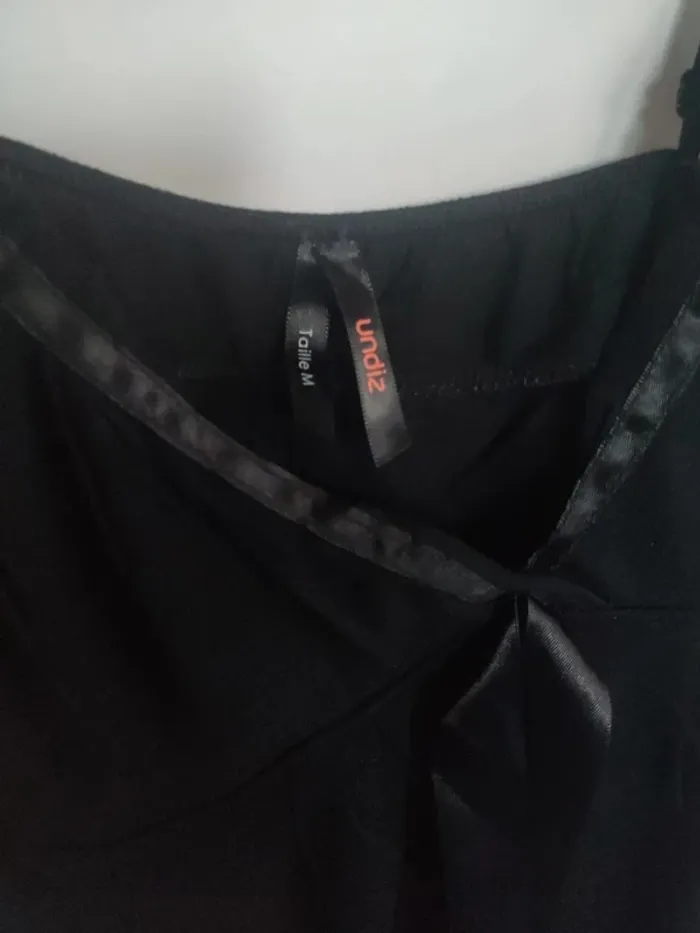 Caraco top un peu élastiqué sous la poitrine, bretelles, décollé et un nœud satinés, base volantée. Bretelles réglables. Très bon état, très doux, très fluide, taille M, Undiz. Longueur 68 cm mais peut être ajustable grâce aux bretelles. #vulariFemmesM38 #vulariUndiz #vulariSexy