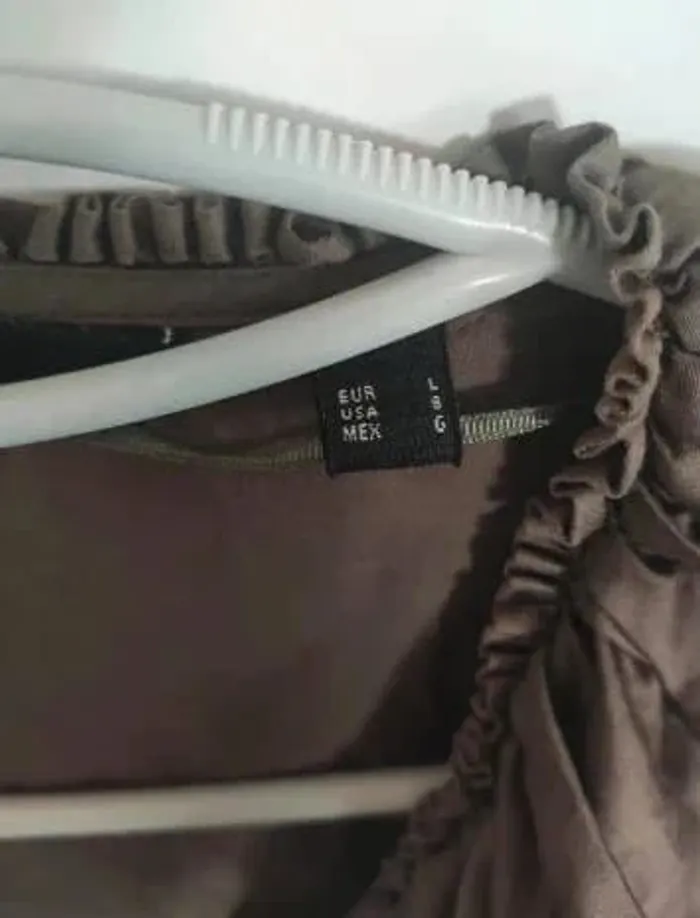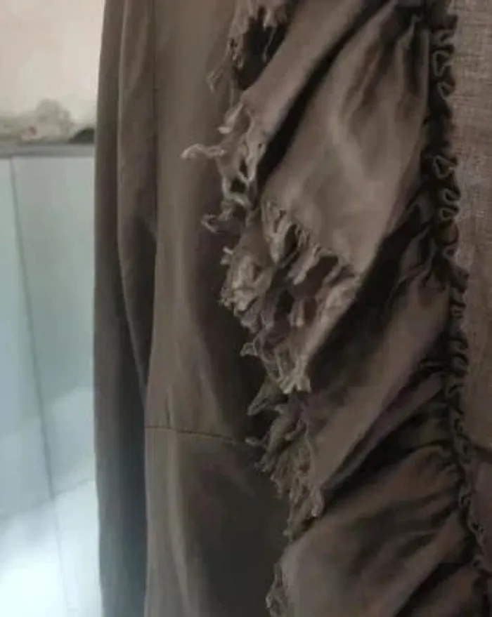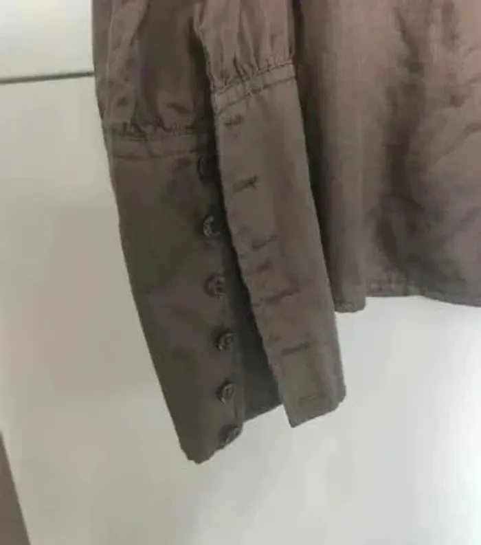 Très jolie blouse, chemisier à manches longues avec un tour de cou entièrement volanté, lien pour le garder plus ou moins ouvert au niveau du décolleté, pinces à la poitrine pour une jolie silhouette et 6 boutons à chaque manche pour un joli tombé sur le bras. Très très bon état, très peu mis, couleur bronze, taille L, acheté chez Mango à 59,95 euros. Longueur totale 68 cm #vulariFemmesL40 #vulariMango