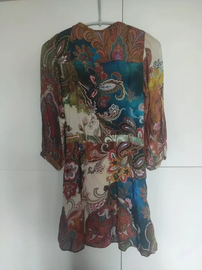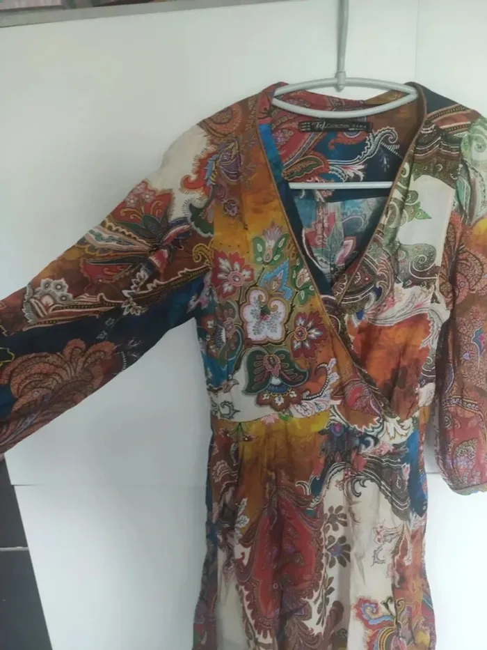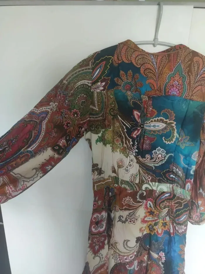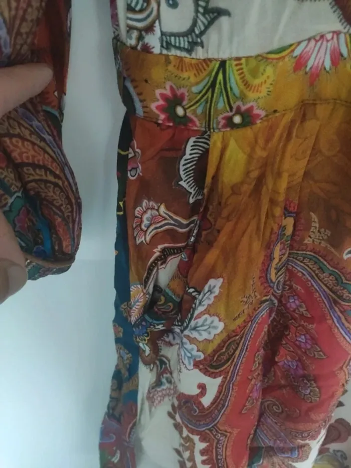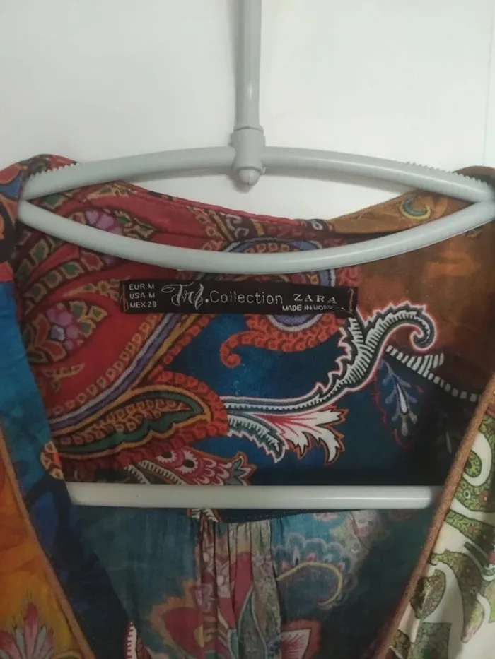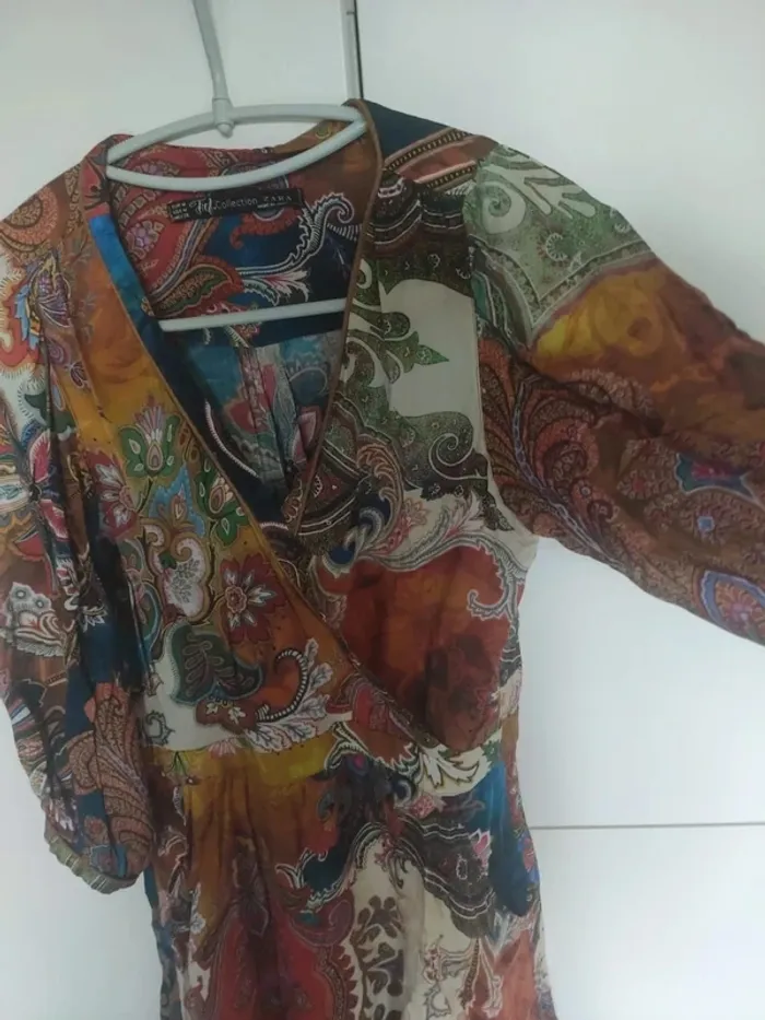 Acheté dans un magasin Zara au siècle dernier 😂 robe imprimé de toutes les couleurs, deux poches sur le côté, haut de la robe style cache-cœur, bande plus épaisse à la taille pour faire comme une ceinture, bas des manches resserré par un bouton, épaules un peu bouffantes. Taille M. Trf collection de Zara, longueur totale 87 cm. Bas de la robe doublée pour limiter la transparence, fermeture éclair sur le côté #vulariFemmesM38 #vulariZara #vulariFemmesVintage
