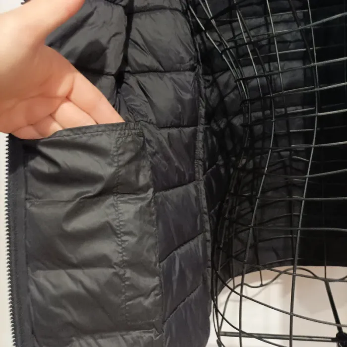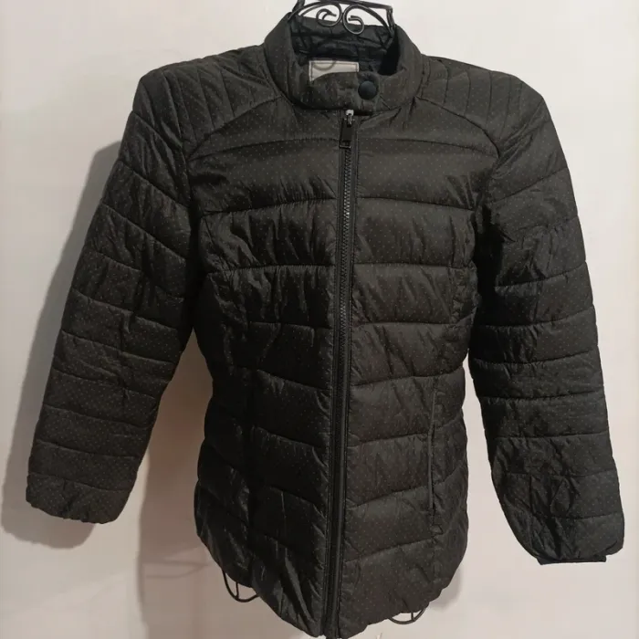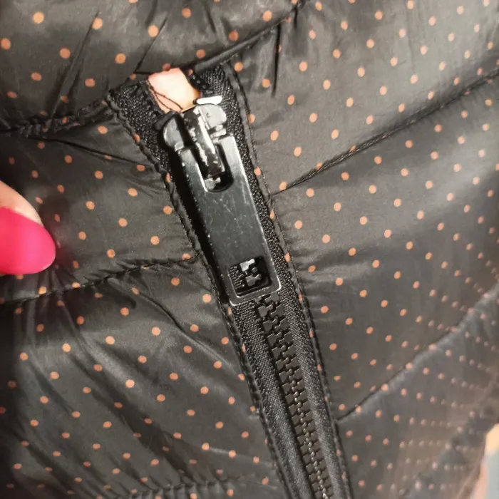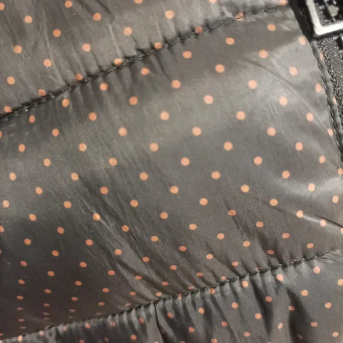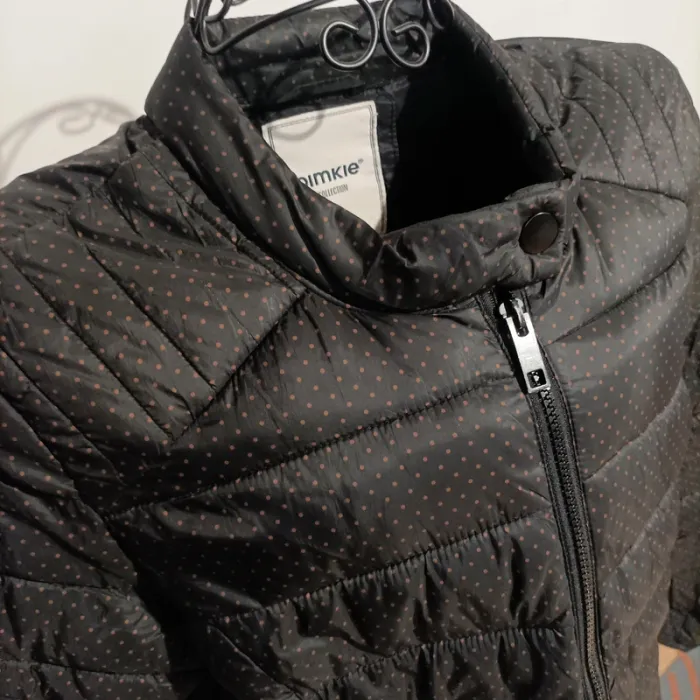 Doudoune matelassée Pimkie noire à petit pois camel taille 36 avec poches extérieures et intérieures en très bon état, juste la tirette de la fermeture éclair qui est légèrement griffée. Plus l'étiquette de taille et composition.