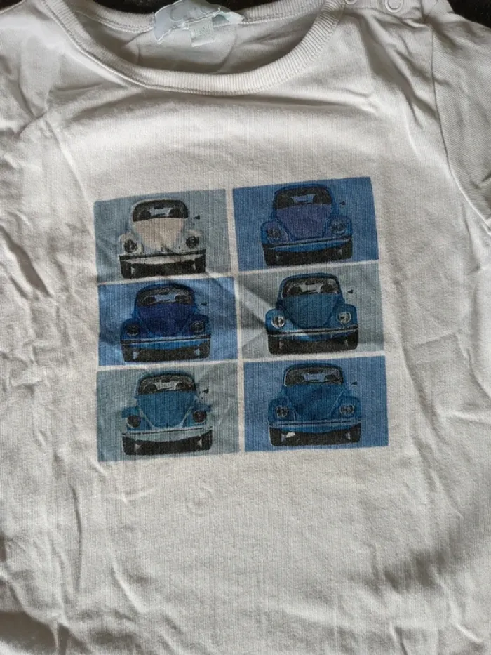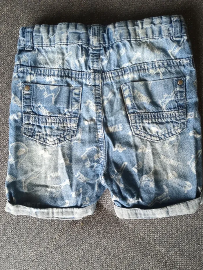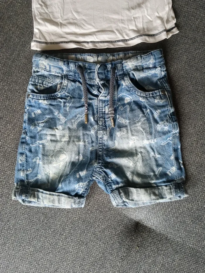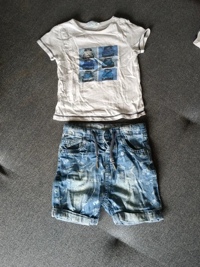 Tee shirt blanc avec 6 voitures , short en jean avec dinosaures. Porté mais encore en bon état