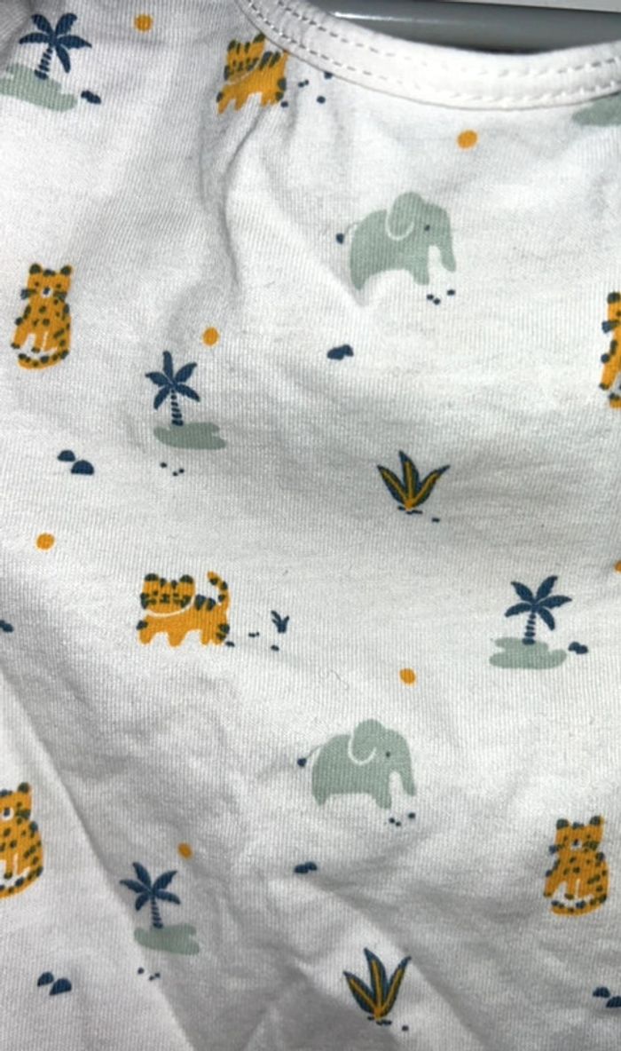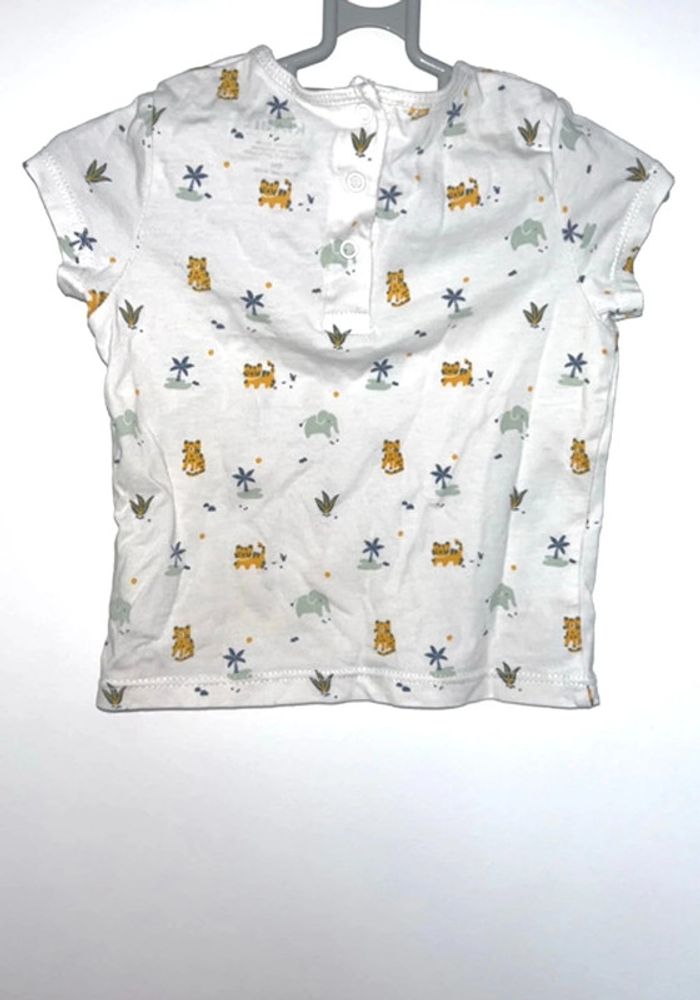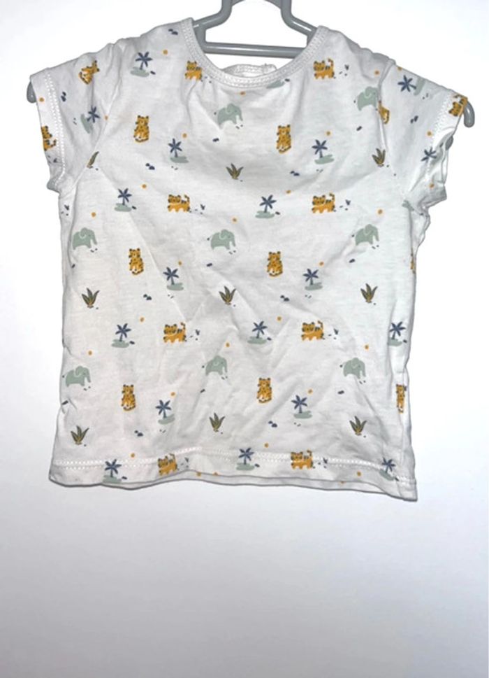 T-shirt blanc manches courtes motifs palmiers, tigres, éléphants Taille 6 mois Excellent état porté 1 fois