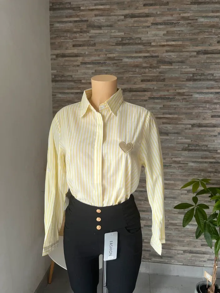 Chemise en coton jaune et blanche et cœurs brodés - photo numéro 1