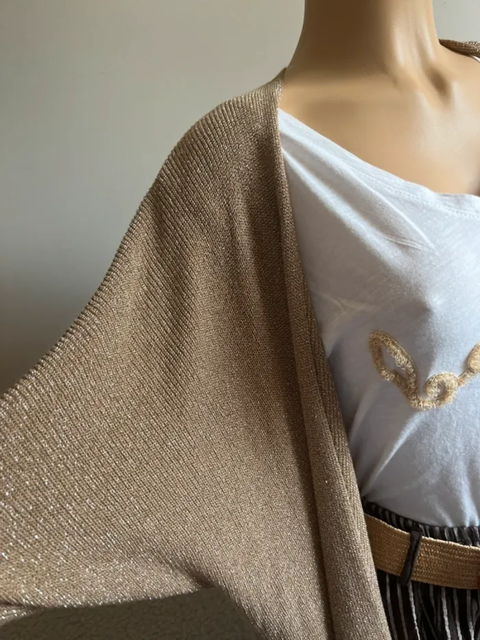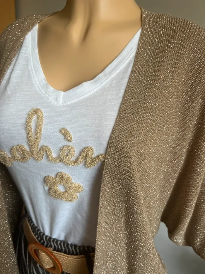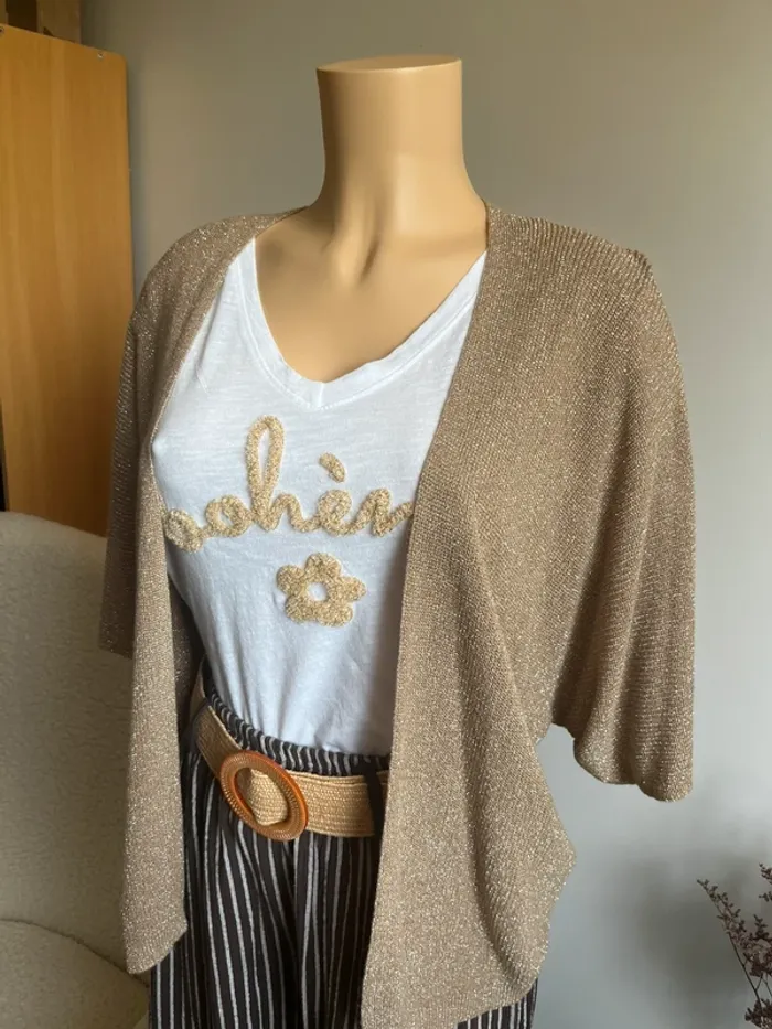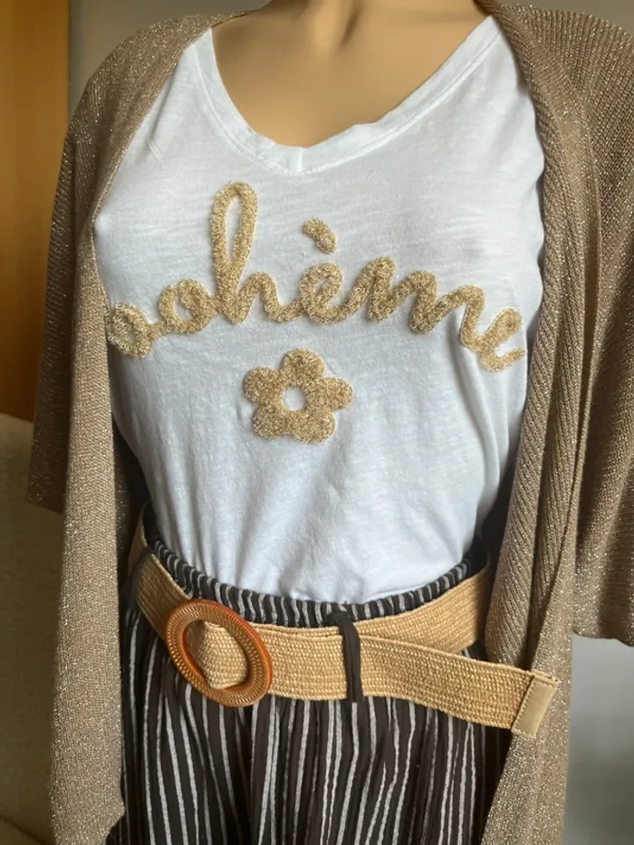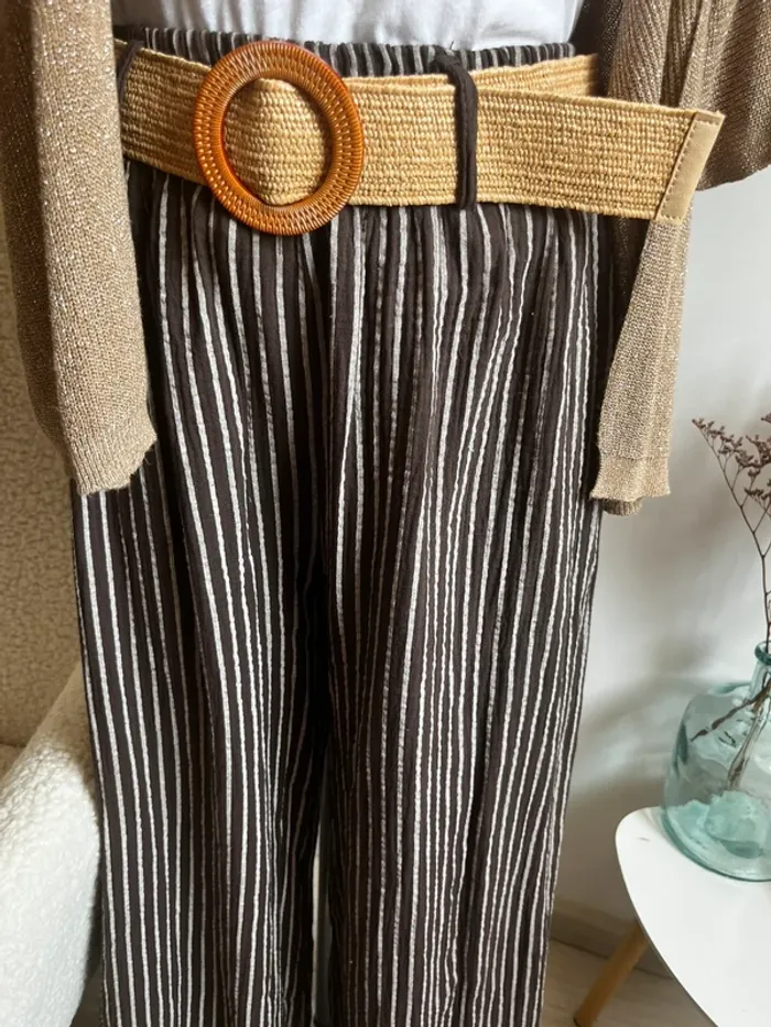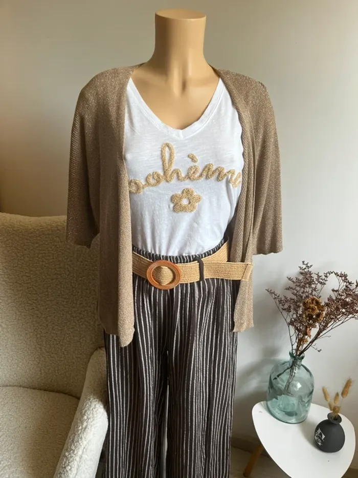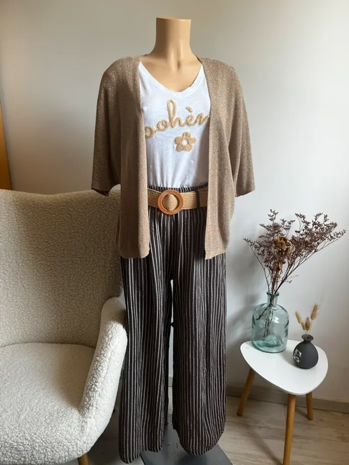 Magnifique lot comprenant un pantalon rayé 100% coton avec ceinture, un t-shirt bohème en coton et un gilet ouvert en viscose et lurex. Le tout neuf jamais porté