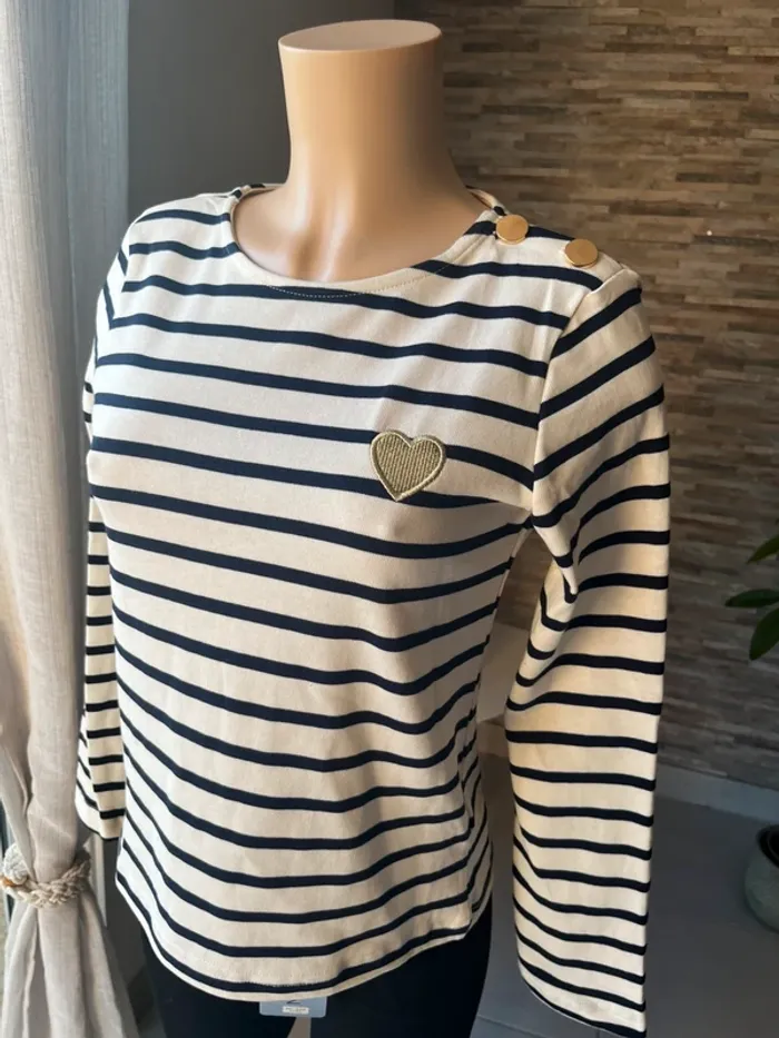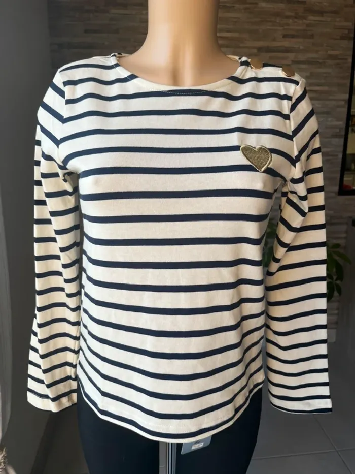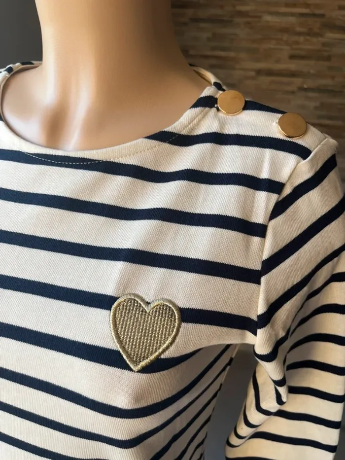Pull léger marinière et cœur brodé doré - photo numéro 2