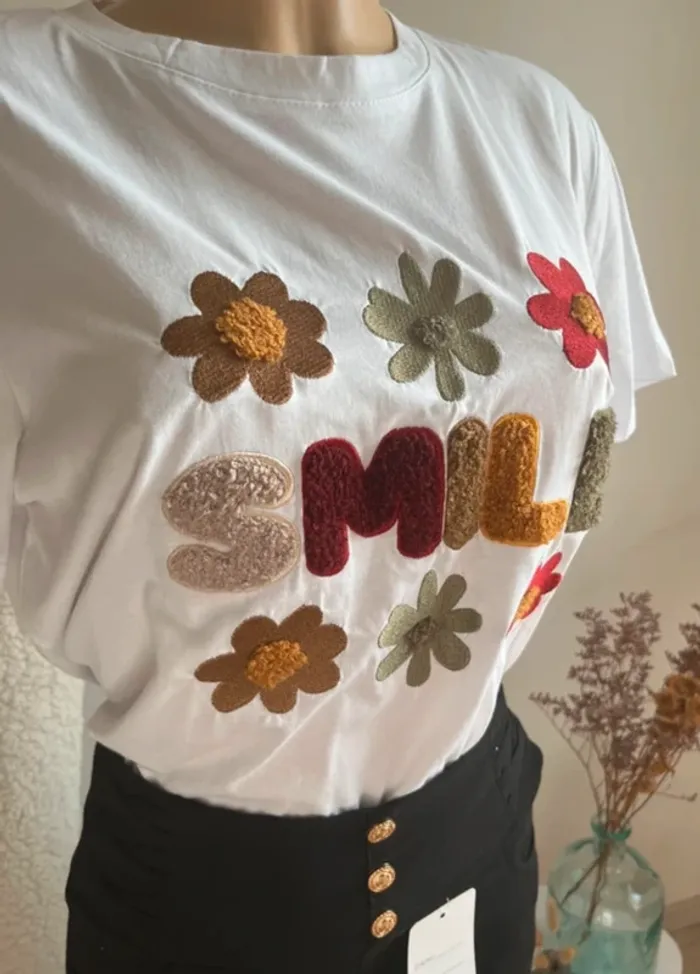 T-shirt « SMILE » et fleurs brodées taille S/M