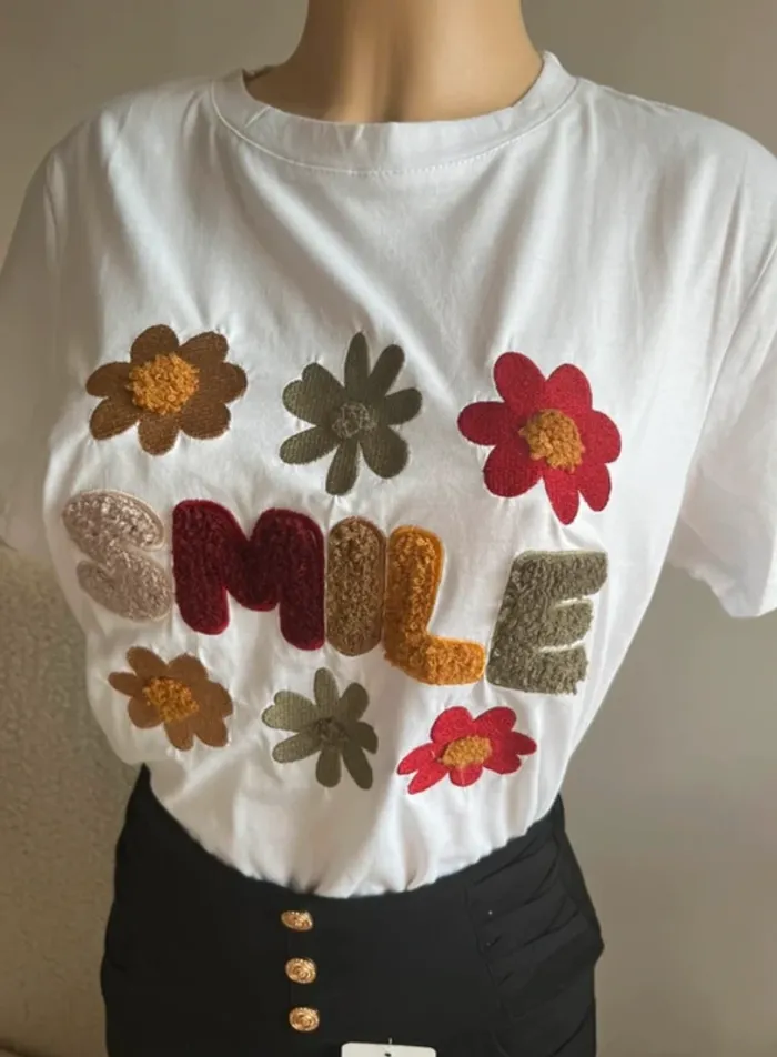 T-shirt « SMILE » et fleurs brodées taille S/M - photo numéro 1