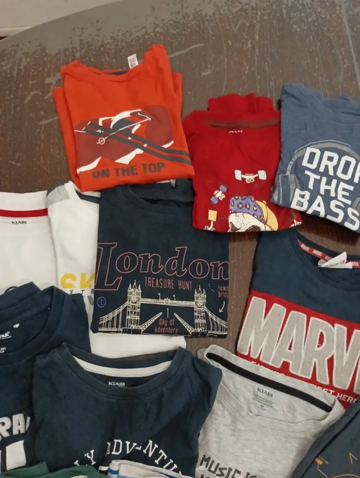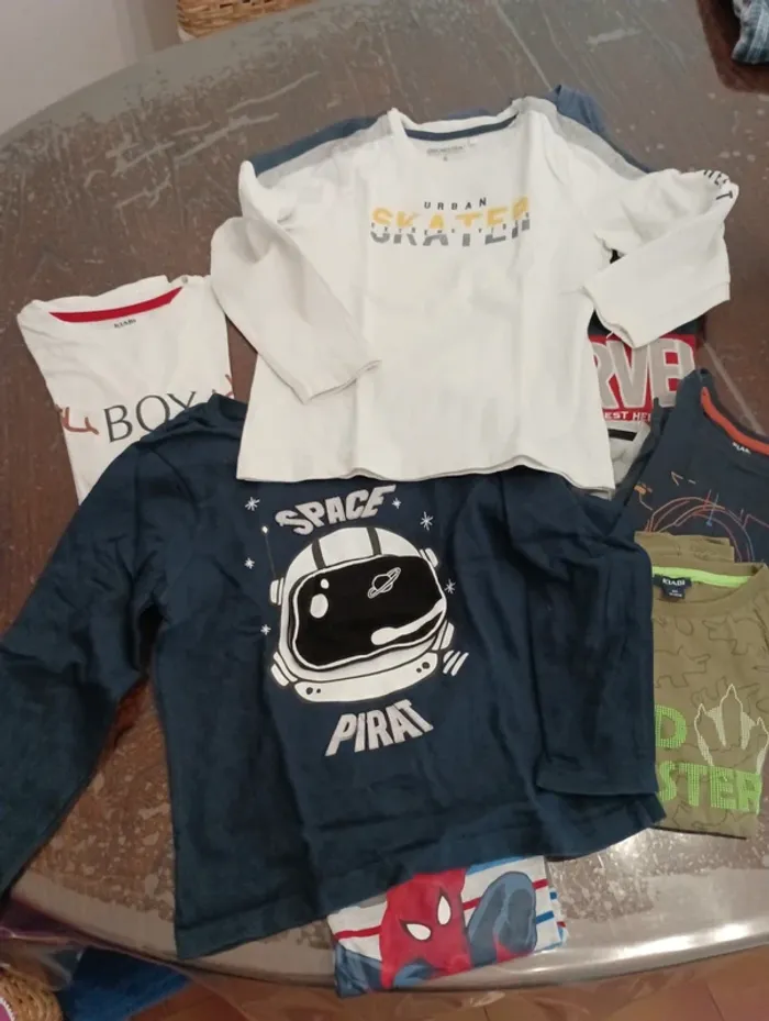 14 tee-shirts manches longues. Moins d'1€ le tee-shirt ! Ex le spiderman beaucoup porté, tâches au niveau des poignets. Sinon portés mais encore en bon état. J'ai mis plusieurs annonces de lot en 6 ans. N'hésitez pas à regarder les autres annonces.