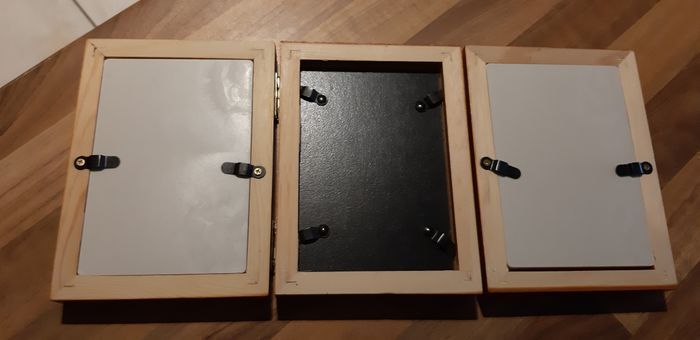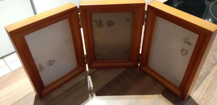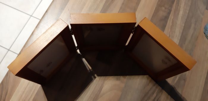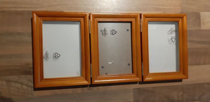 Cadres photos. Annonce 1. Bois et plastique, pas de verre. Donc moins de risque pour un enfant. Neuf, il y a encore l'opercule à décoller sur les façades en plastiques. Celui du milieu est pour mettre 1 photos et les 2 autres à chacune des extrémités sont plus profonds pour pouvoir y mettre 1 photo, 1 souvenir petit objet, une empreinte main pied enfant,... Voici les dimensions : 34,5 x 15,5 pour l'article en entier. Pour des photos d'environ 8,5 x 12,5.