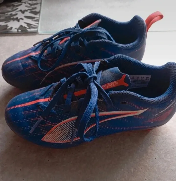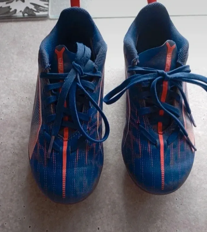 Paire de chaussures de foot de marque puma Pointure 31 Bleu et corail Très bon état général petite usure voir dernière photo.. Remise lot appliquees 😉