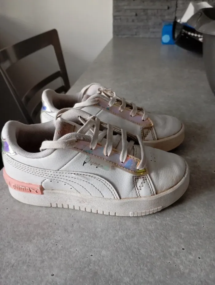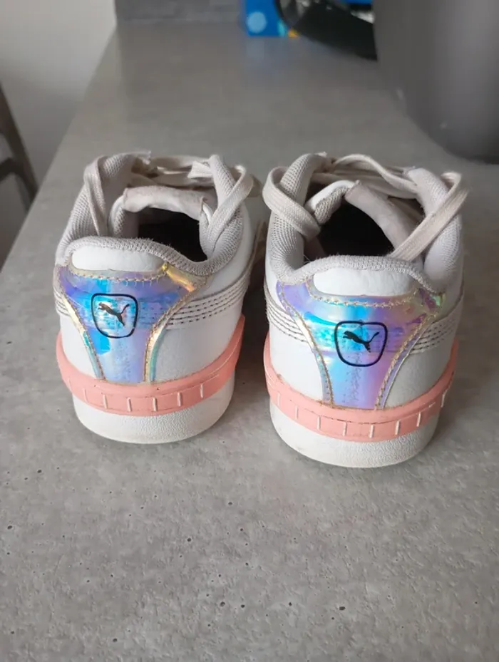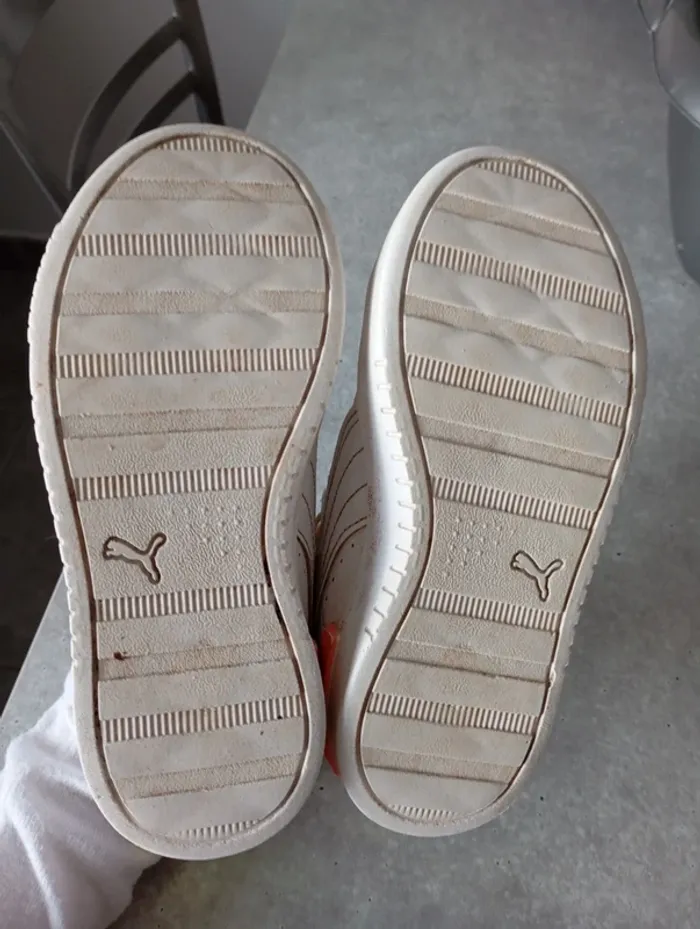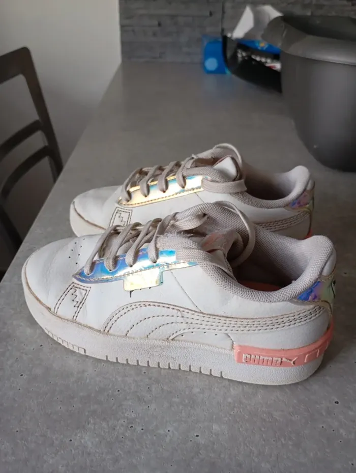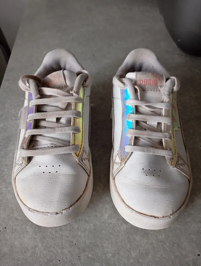 Paire de basket pour fille blanche Pointure 29 marque puma a lacets Bon état général ( quelques marques d'usure visible sur photos ) Remise lot appliquees dans mon dressing 🦋☀️