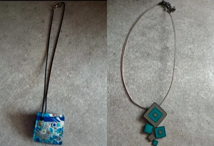 Collier femme 3€ l'unité Le bleu est en verre L'autre gris et verre Très bon état D'autres bijoux avec remise lot appliquees dans mon dressing 😉☀️