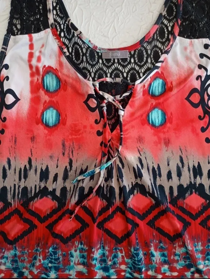 Jolie tunique femme dans les teintes corail, turquoise, noir, marron et rouge. Fluide De chez formul taille 1 Parfait état peu porté 96% polyester et 4% elasthane Dim 73 cm de longueur, 43 cm sous les aisselles D'autres articles dans cette taille avec remise lot appliquees 🦋😉