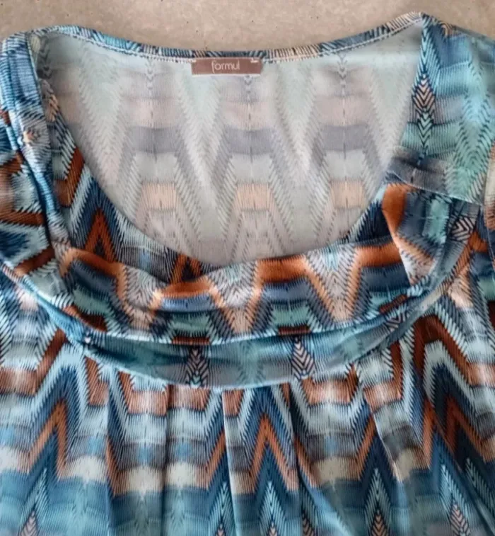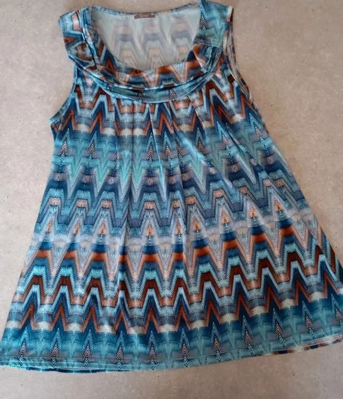 Joli débardeur femme bleu et marron à motif Taille 2 de chez formul Fluide et ample Très bon état 95% polyester et 5% elasthane Dim 43 cm largeur sous aisselles, 63 cm longueur. D'autres articles dans cette taille avec remise lot appliquees 🦋😉