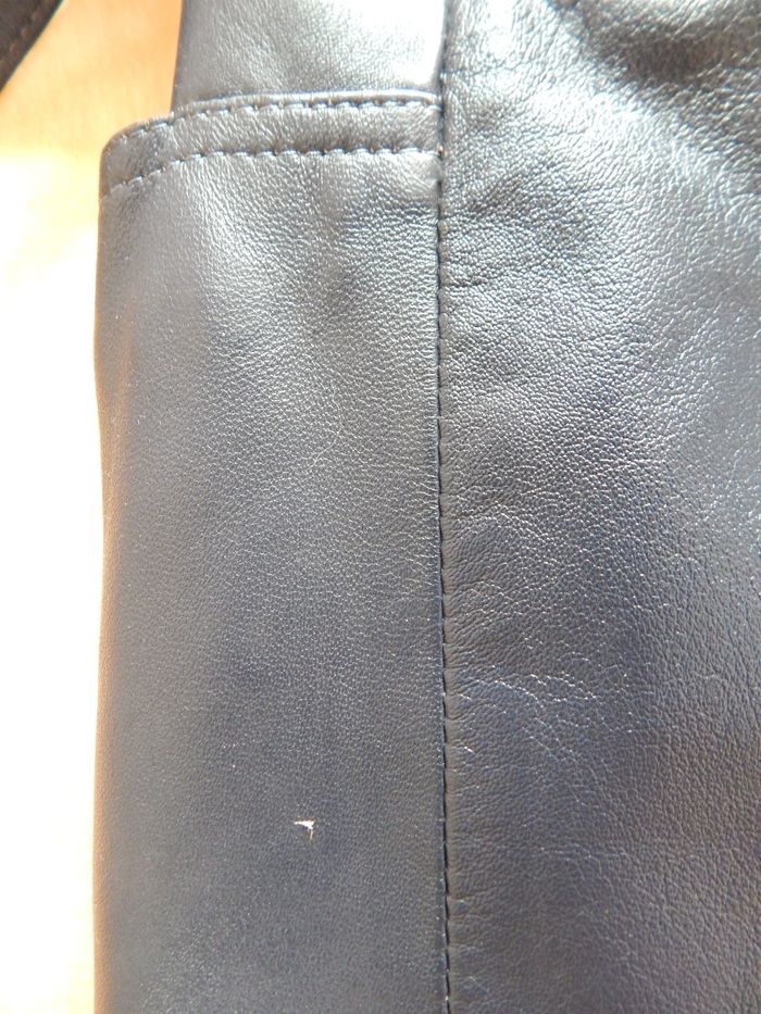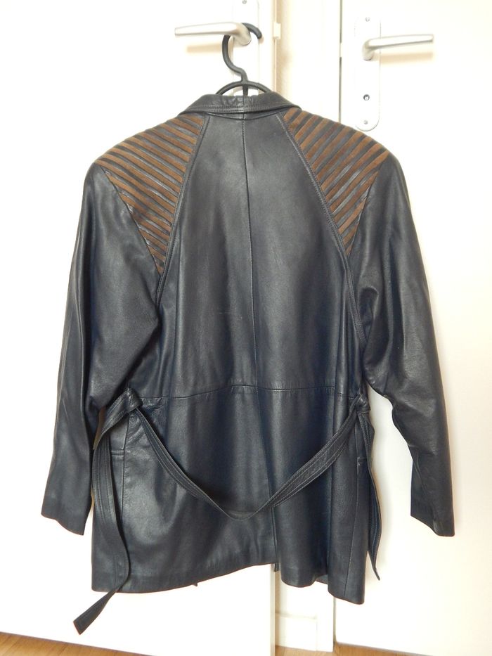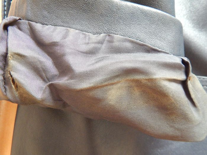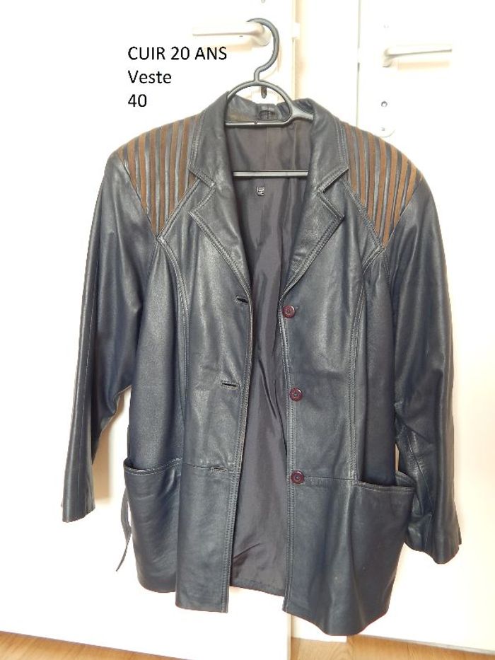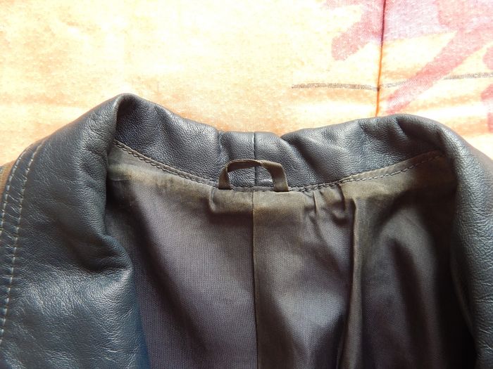 Veste avec épaulettes et ceinture. Doublure ternie au col et aux manches, un peu abimée à une manche. Boutons déplacés et très petit accroc derrière. Marque : Cuir 20 ans