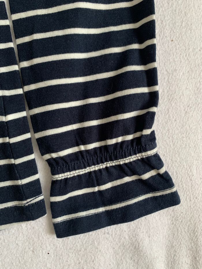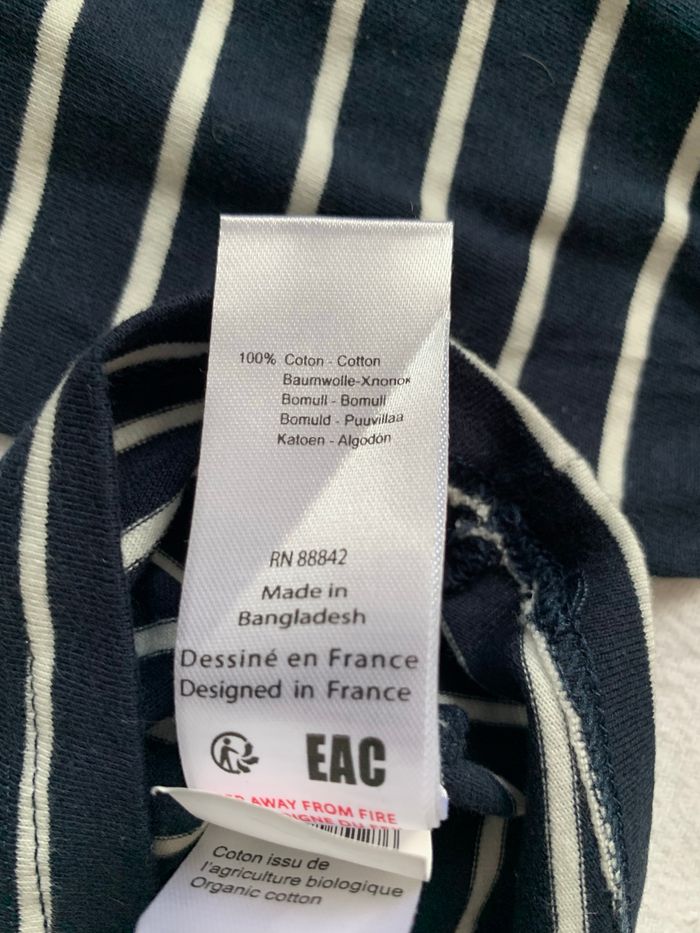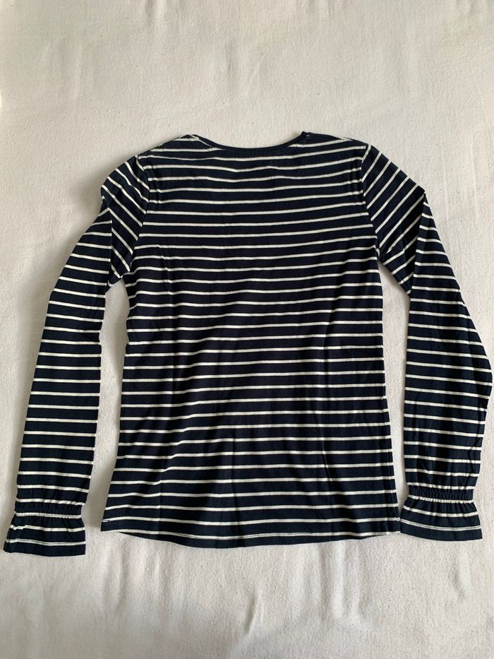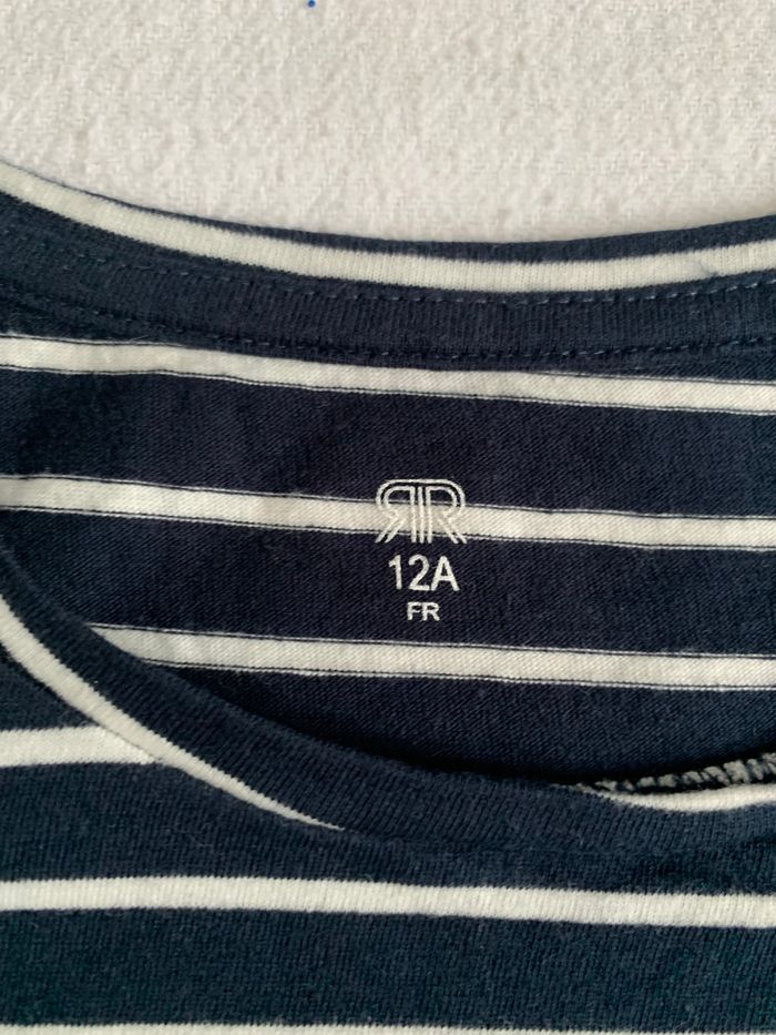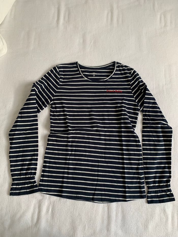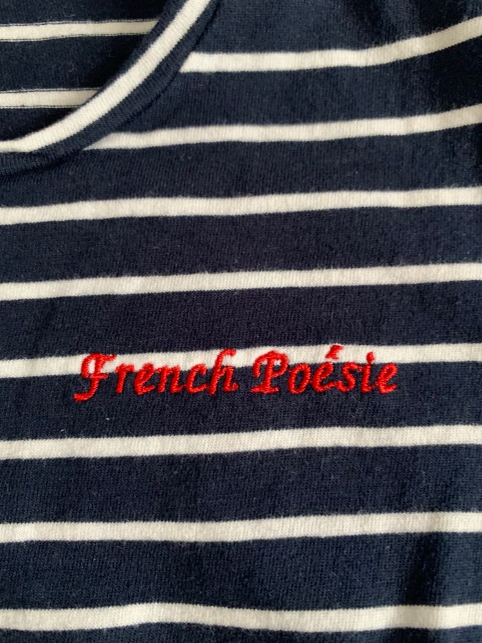 Tee shirt rayé marin avec "Franch poésie" brodé en rouge sur le devant et les extrémités des manches sont froncées, tee shirt neuf de chez la redoute taille 12 ans