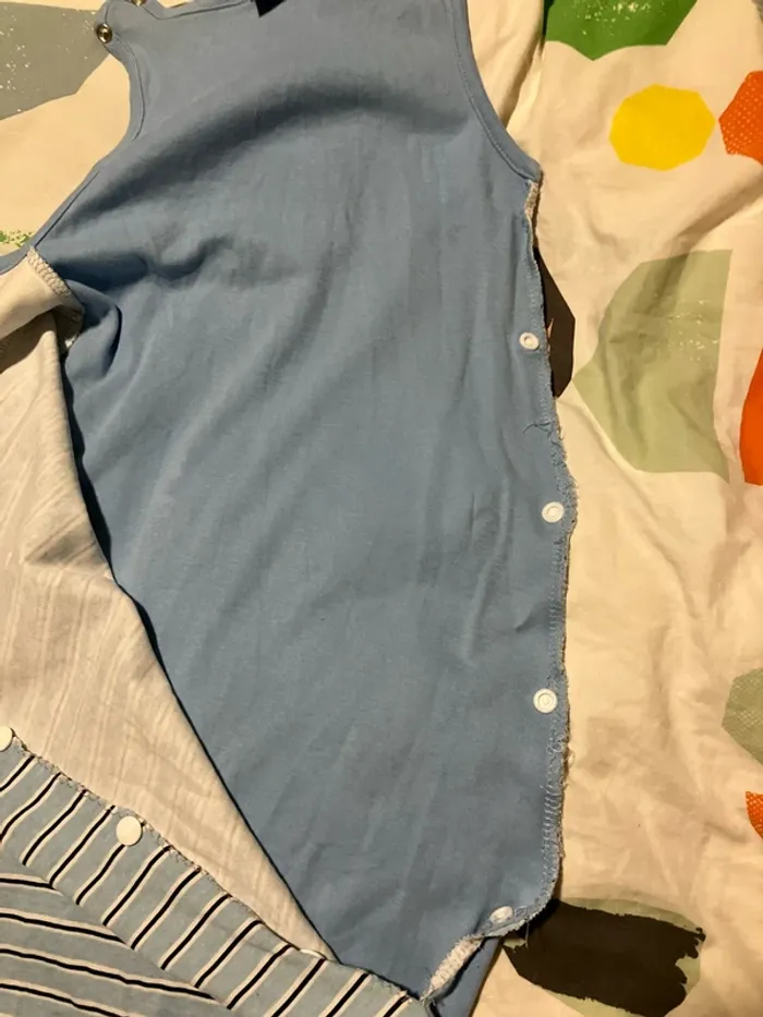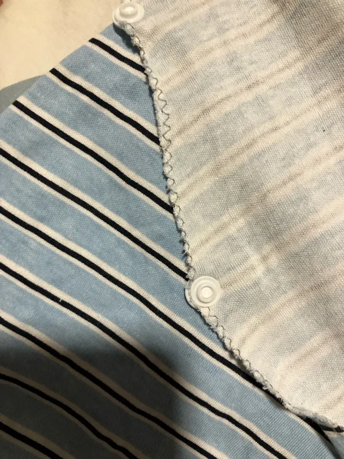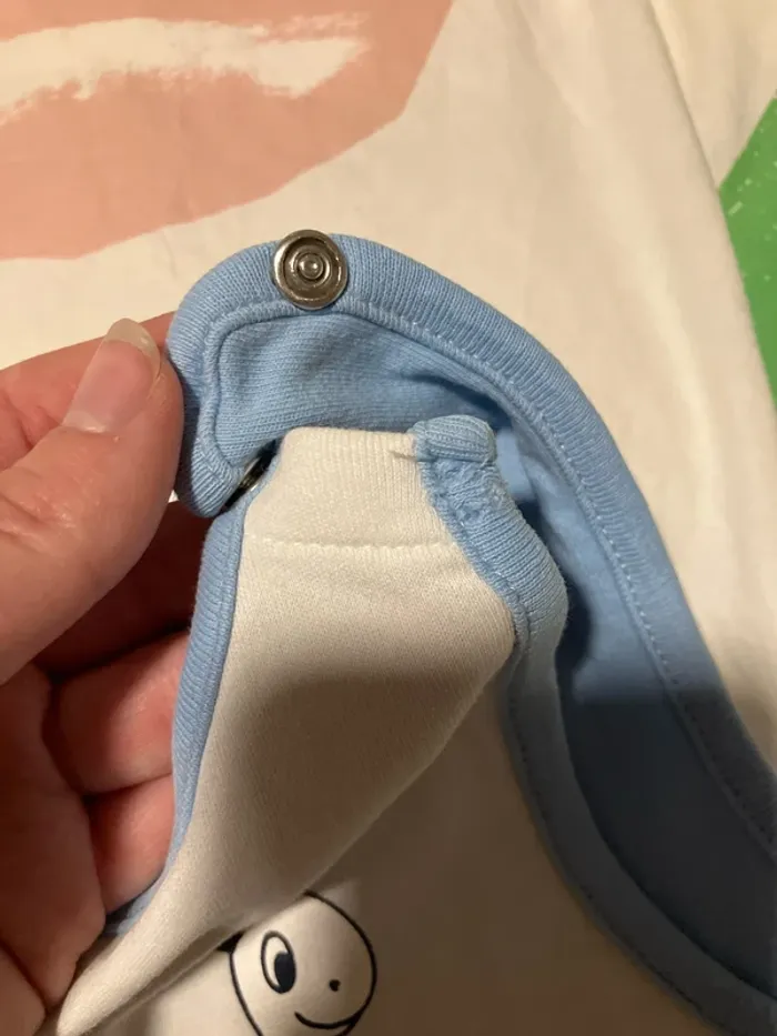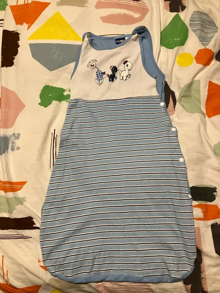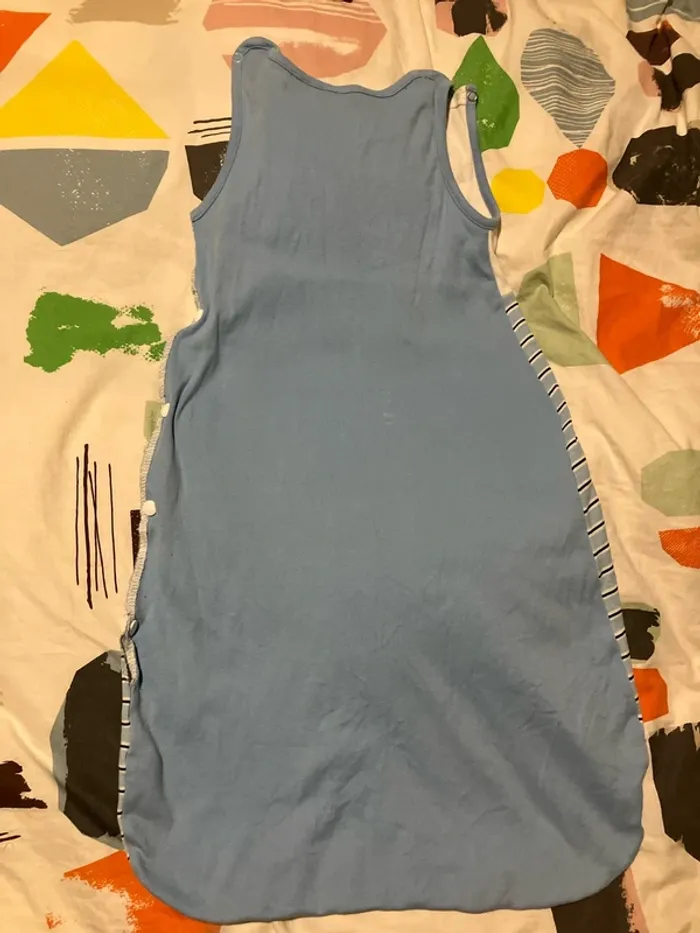 Gigoteuse légère en taille 6-12 mois J’ai découpé et surfilé le côté et mis des boutons pressions pour pouvoir plus facilement installer bébé. (Voir photos) Il manque un bouton pression en haut (voir photo) mais ne gêne pas pour fermer la gigoteuse
