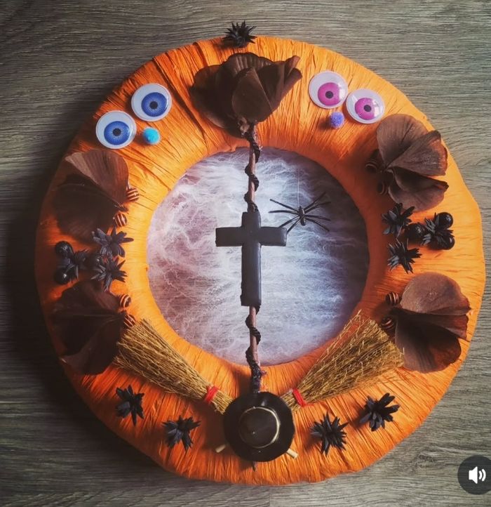 Voici ma couronne faite main, avec ses balais de sorcière, ses yeux espiègles et ses détails mystérieux. Une déco qui mélange l’effrayant et le rigolo pour accueillir les petits monstres le soir du 31 👻🧡