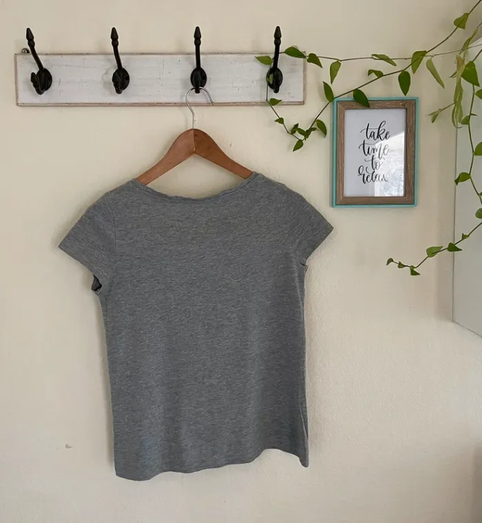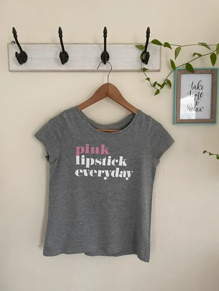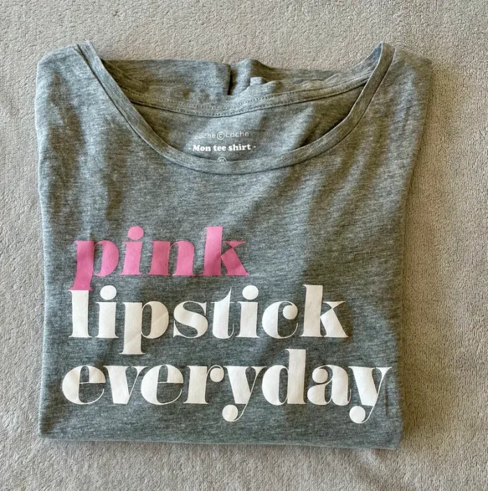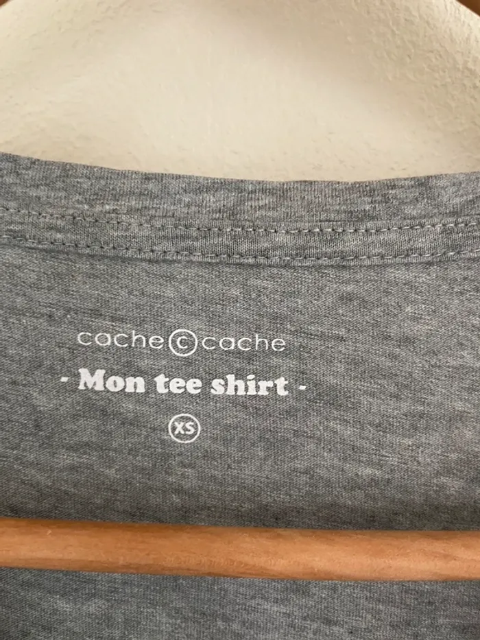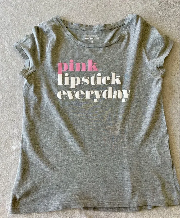 #tshirtmanchescourtes #cotonviscose #tshirtgris #pinklipstickeveryday #tshirtimprime #monteeshirt #cachecache #taillexs #taille34 #etatneuf