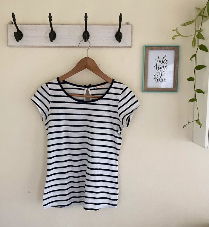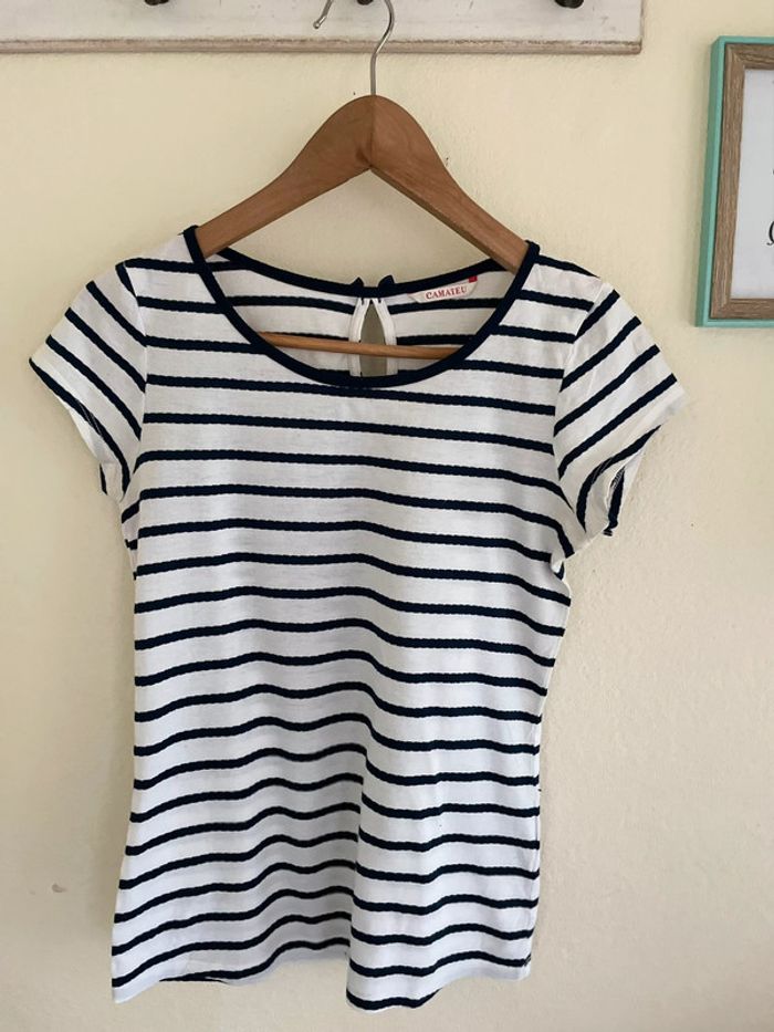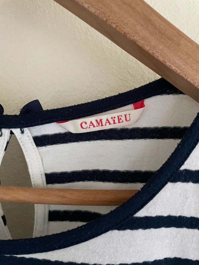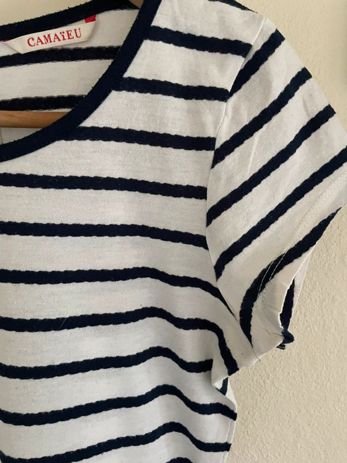 #marinieremanchescourtes #tshirtinspirationmarine #tshirtrayé #noeudspapillons #noeudsdansledos #tshirtstylemarin #camaieu #tailles #taille36 #tresbonetat