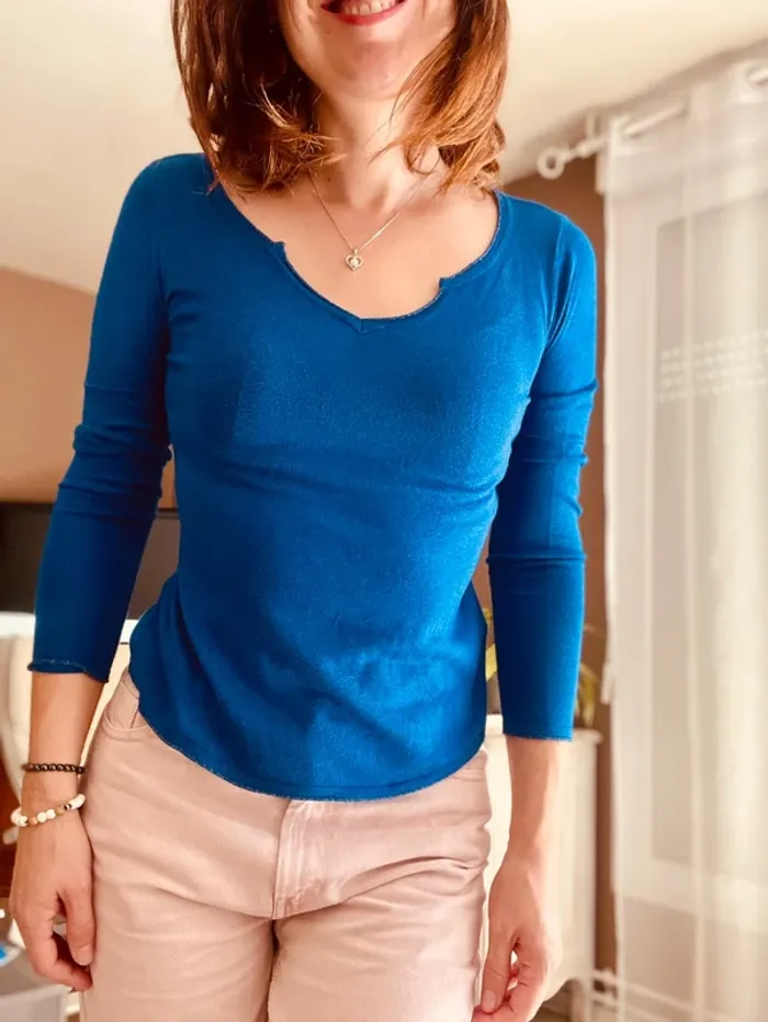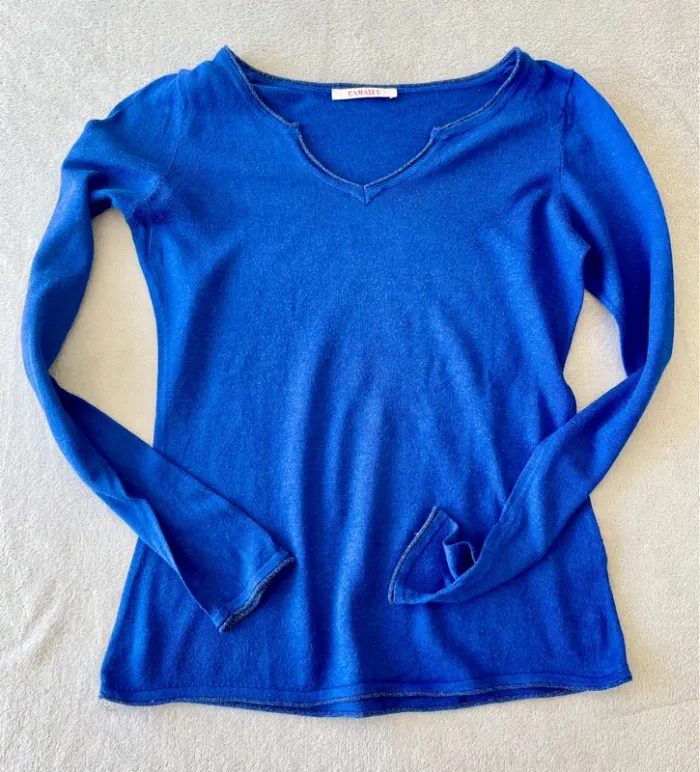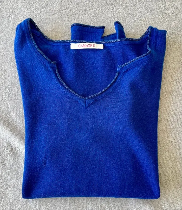 #pullbleuelectrique #pullfin #pullcolv #pullcamaieu #lisereargentesurlecol #lisereargentealataille #taillexs #taille34 #etatneuf