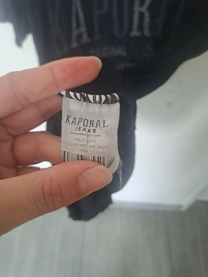 Tee-shirt col rond Manches courtes Pouvant être mixte Couleur noir avec inscription couleur gris Taille M (38) Marque Kaporal