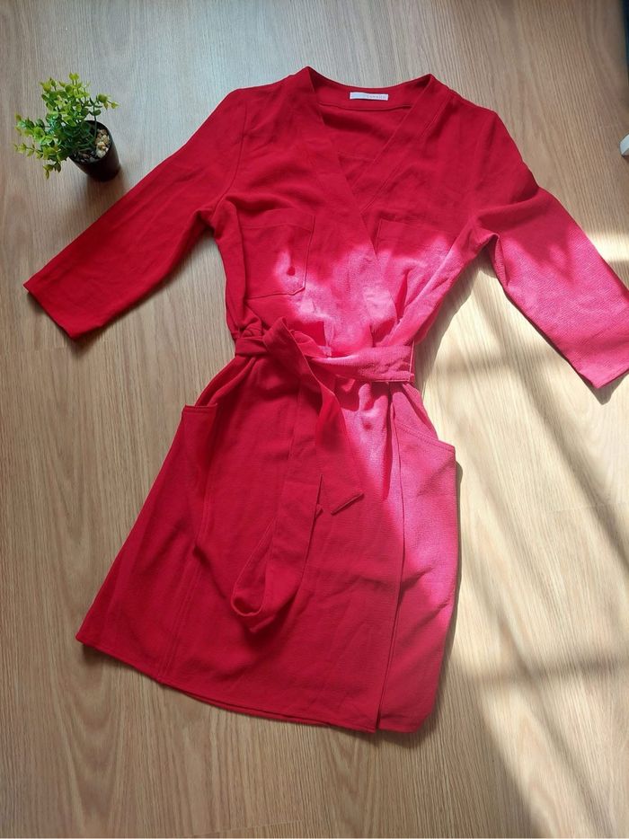 〰️ Robe, rouge, manches 3/4, en crêpe, effet cache coeur, 2 poches, ceinture à la taille