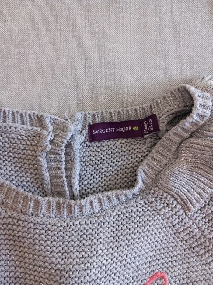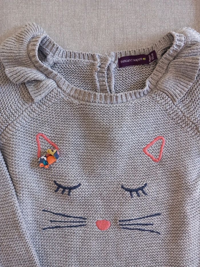 Joli petit pull "chat". Gris fil brillant. Petit col. Taille 2 ans. Sergent Major. Très bon état (à noter une trace en bas du pull Cf. Photo. Très peu visible surtout une fois portée. Mais je préfère le notifier. 😉)