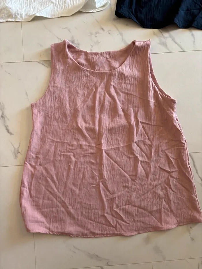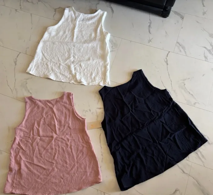 Lot de 3 débardeurs en polyester effet fripé pour femme T. 42, neufs dont deux avec étiquette. #merine103 #merine103vetementfemme #merine103vetementfemme42