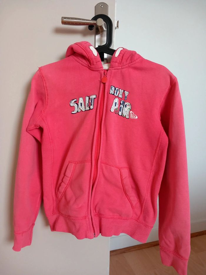 Gilet zippé avec capuche Roxy. Couleur un peu vieux rose. Pas vif. Taille 34. XS. Marqué 14 mais équivaut à un xs. A beaucoup été porté mais reste en très bon état. À noter deux mini traces sur le bras mais peu visible une fois porté. (Cf. Photo)