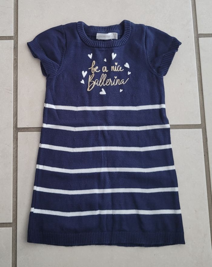 Robe pull, de couleur marine, avec motif et inscription blanc doré, de la marque Orchestra, taille 3 ans (98 cm), en très bon état. Article lavé pour la vente.