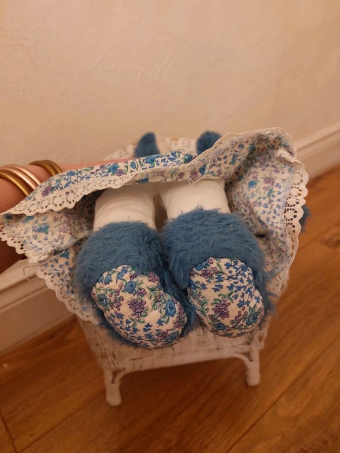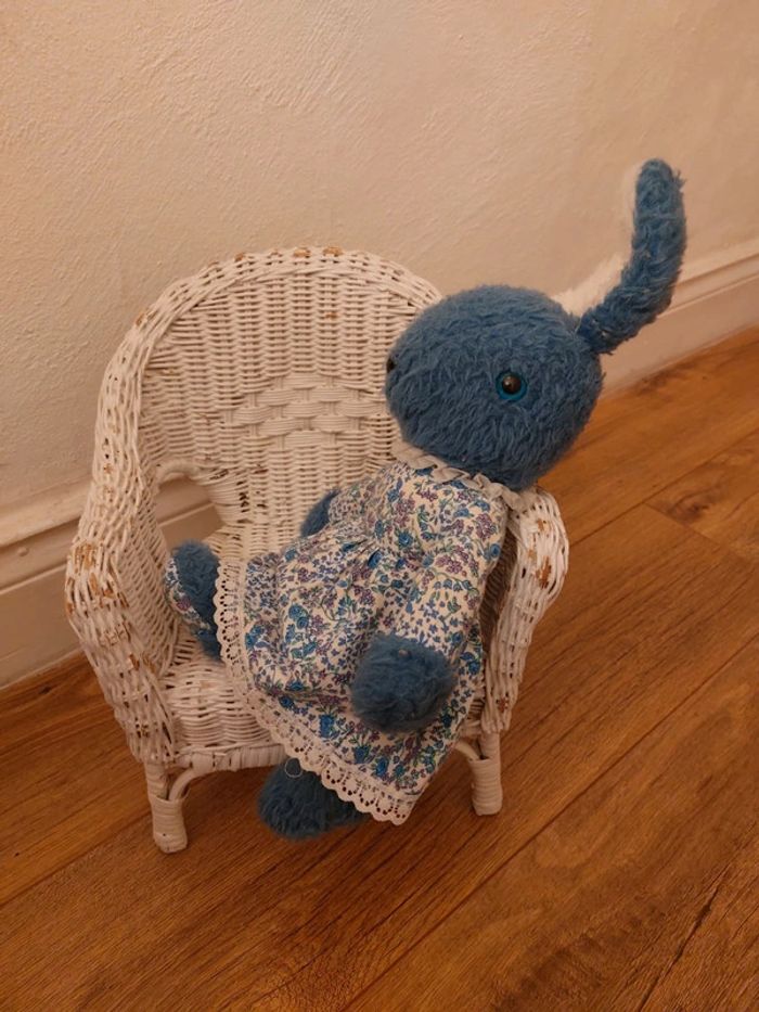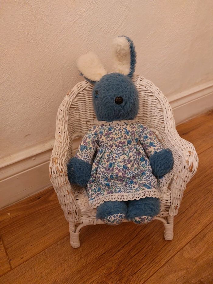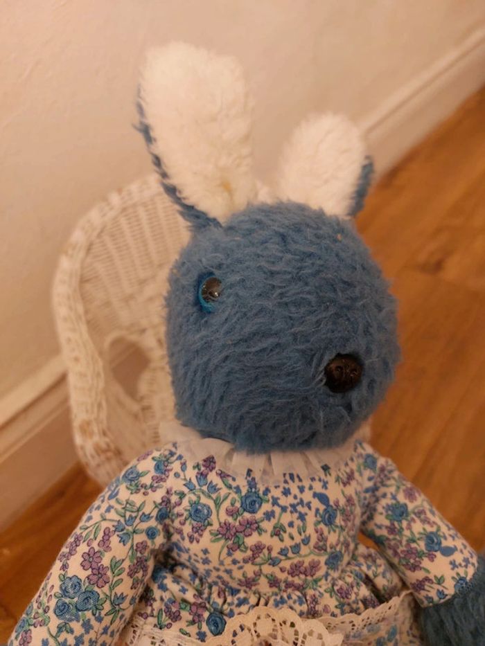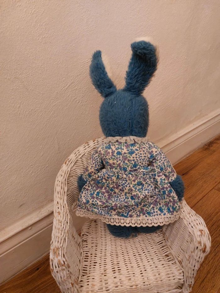 Rare et vintage, doudou lapin bleu avec sa robe à fleurs liberty Ajena